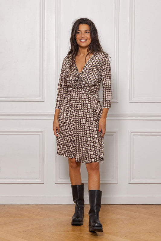€59,00€47,20Bernsteinfarbenes kurzes Wickelkleid mit schwarzem und elfenbeinfarbenem Aufdruck