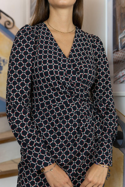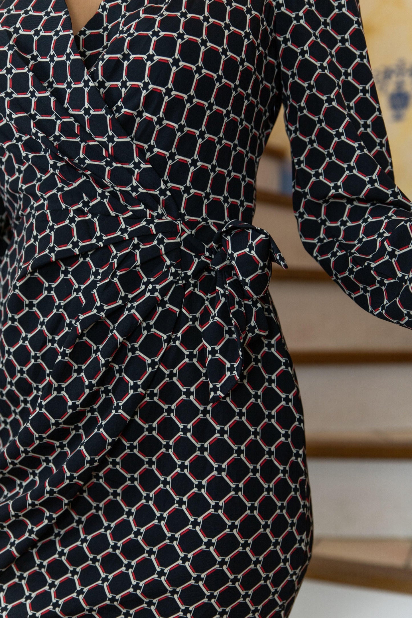 Cette élégante robe portefeuille à la longueur mi-cuisse et droite, se distingue par son imprimé classique et délicat, qui lui donne toute son originalité.