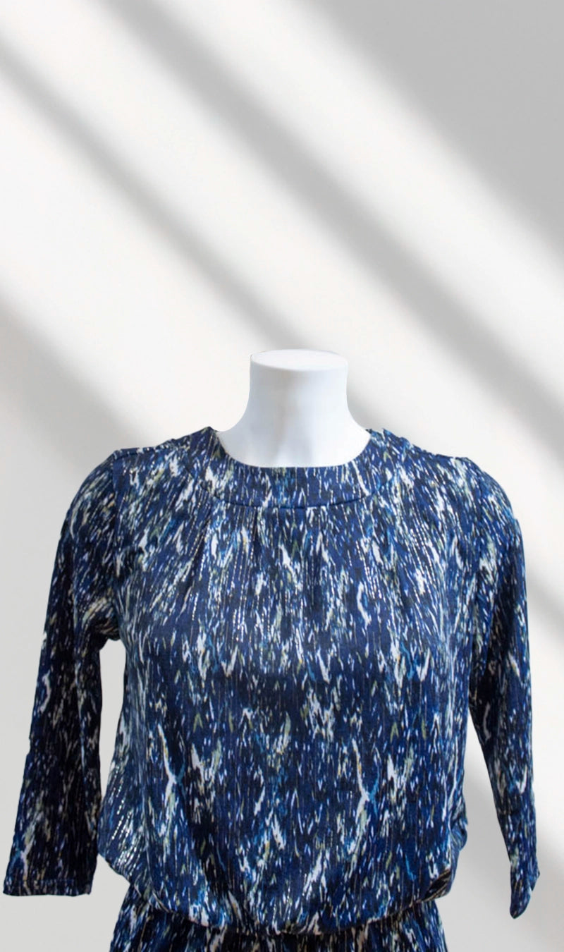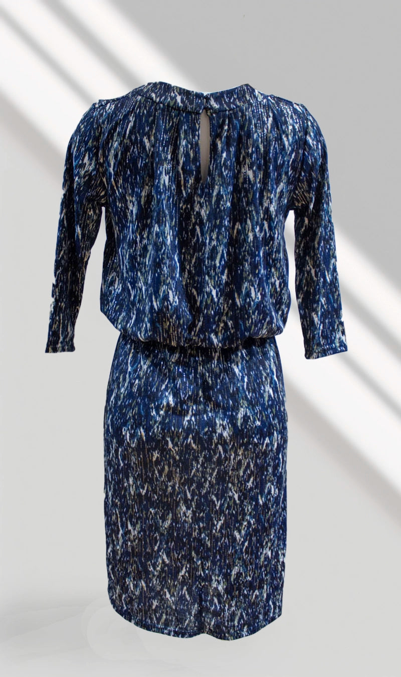 Avec sa coupe droite et sa longueur genou, cette pièce assure un équilibre parfait entre confort et sophistication. Le col rond et les manches 3/4 apportent une allure classique et intemporelle, tandis que le détail goutte d’eau dans le dos, orné d’un fil brillant, dévoile une subtile touche de féminité. Son imprimé bleu et blanc lumineux ajoute une note de fraîcheur et d’originalité à cette robe polyvalente.