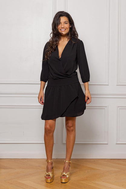 Cette robe courte midi, fabriquée avec soin dans notre atelier parisien, se distingue par son col cache-cœur en V plongeant et ses manches 3/4 ornées de volants élégants. La ceinture élastique à la taille cintrée met en valeur vos courbes, tandis que la coupe portefeuille évasée aux jambes apporte une fluidité raffinée. Sa couleur unie noire offre une toile de fond parfaite pour une allure chic et intemporelle, incarnant le véritable chic parisien et l'élégance française.