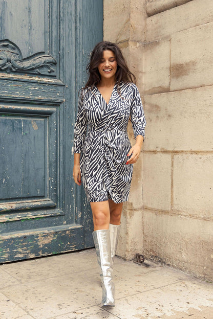 Cette robe courte élégante, fabriquée à Paris, se caractérise par un col cache-cœur flatteur, des manches 3/4 sophistiquées et une taille cintrée qui met en valeur votre silhouette. Le fond blanc orné d'un imprimé zébré noir apporte une touche de modernité et d'élégance à cette robe française chic, idéale pour les femmes en quête d'un style unique.