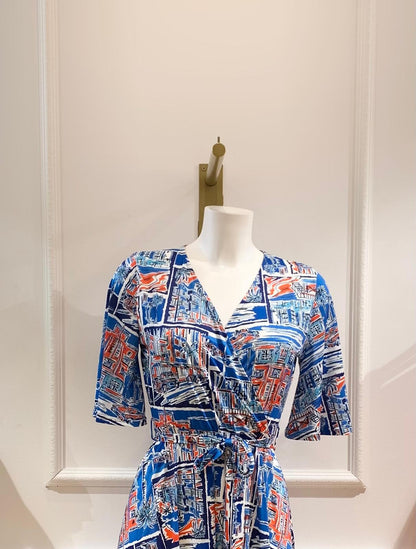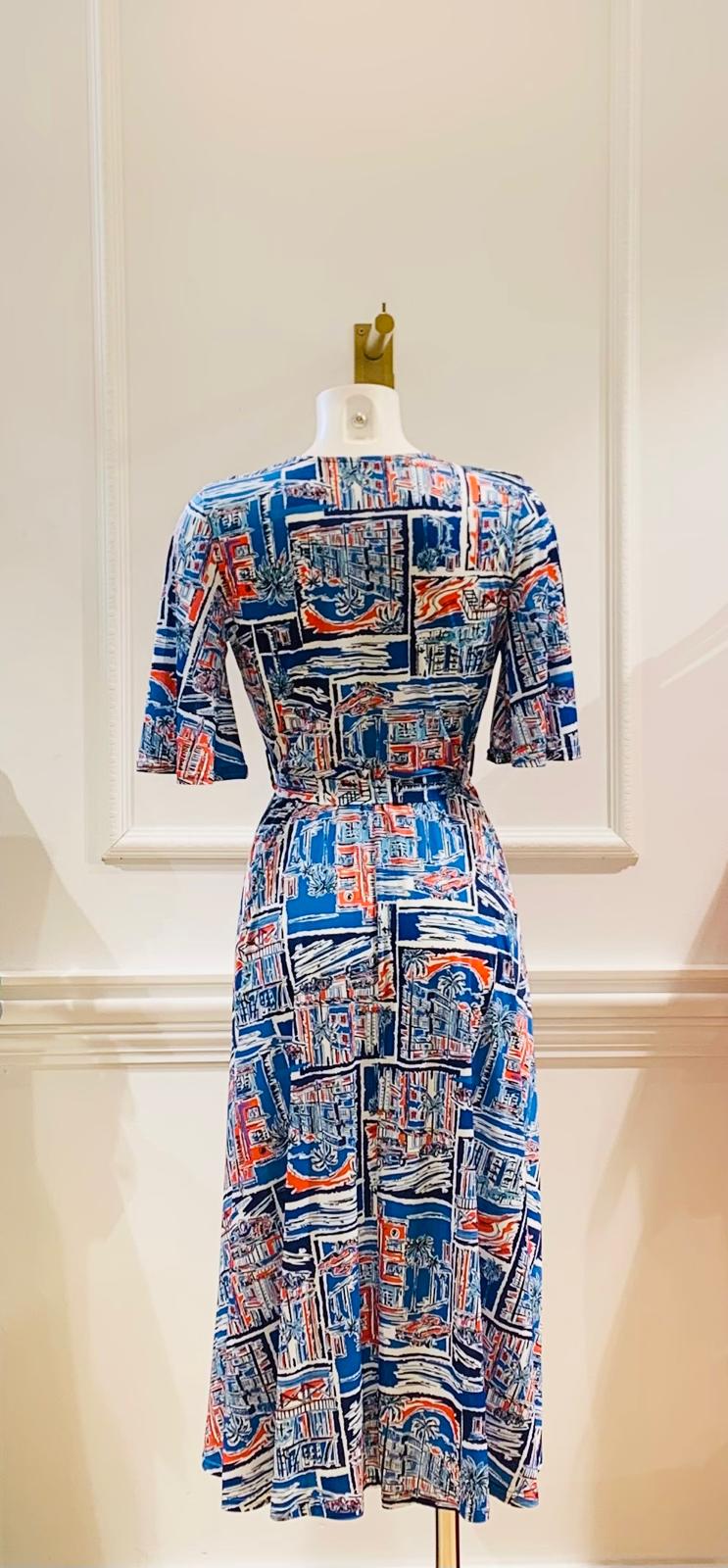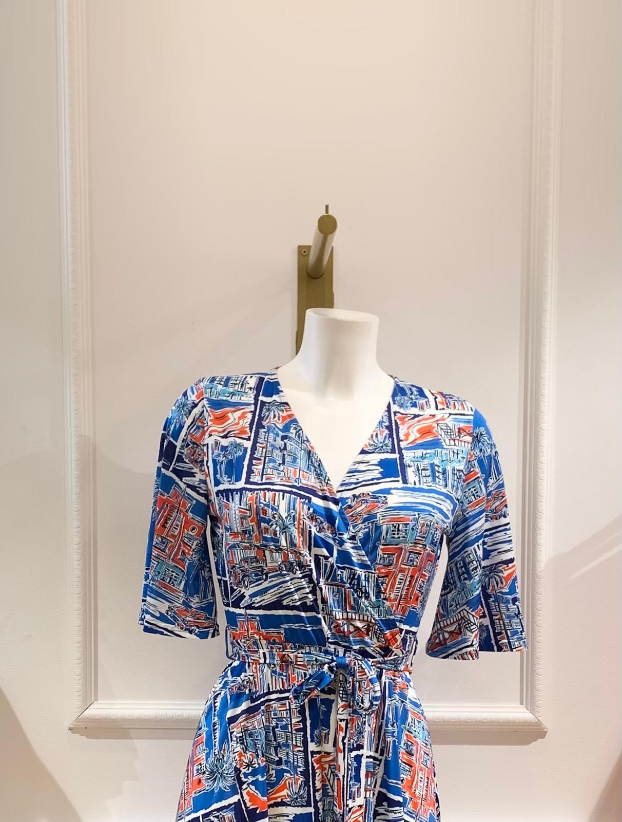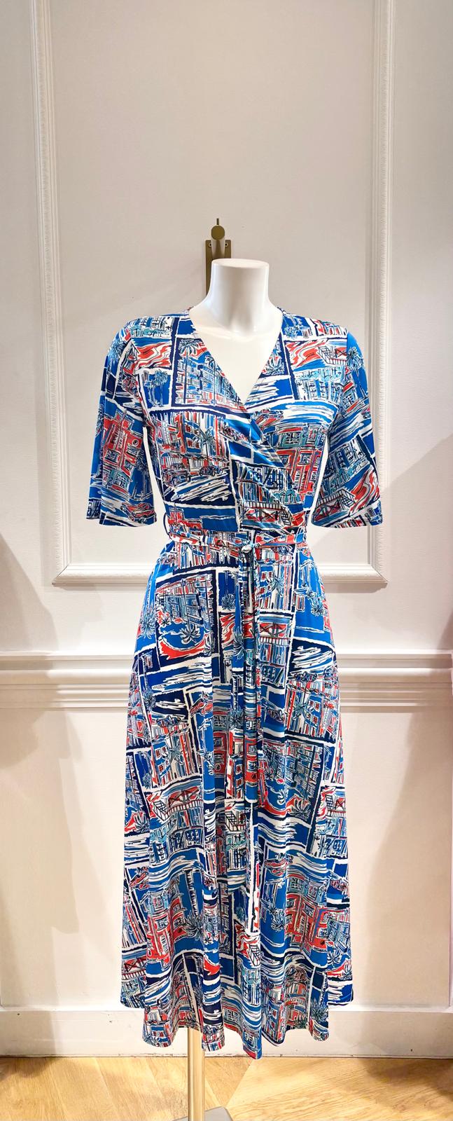 Fabriquée avec soin dans nos ateliers parisiens, cette robe Made in France est conçue pour sublimer votre silhouette avec son col cache-cœur flatteur et sa taille cintrée avec ceinture intégrée. Ses manches 3/4 ajoutent une touche de sophistication, tandis que sa jupe longue et fluide accompagne chacun de vos mouvements avec grâce. Son imprimé Playa Bleu, inspiré des vagues et des reflets marins, évoque la légèreté et l’évasion, parfait pour un look à la fois élégant et décontracté.