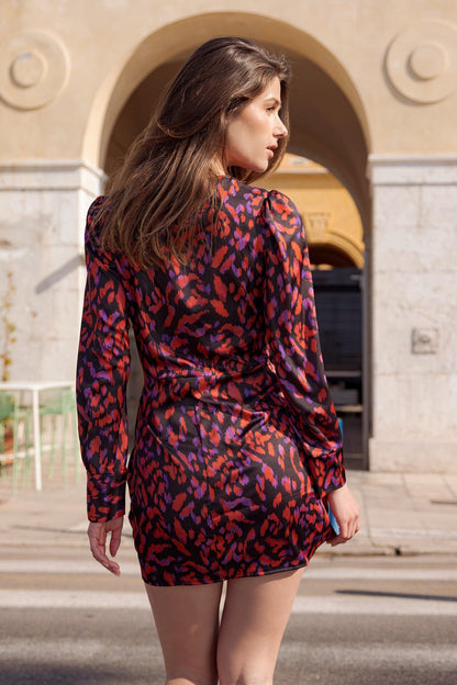 Cette élégante robe portefeuille à la longueur mi-cuisse et droite, se distingue par son imprimé lumineux et estival.