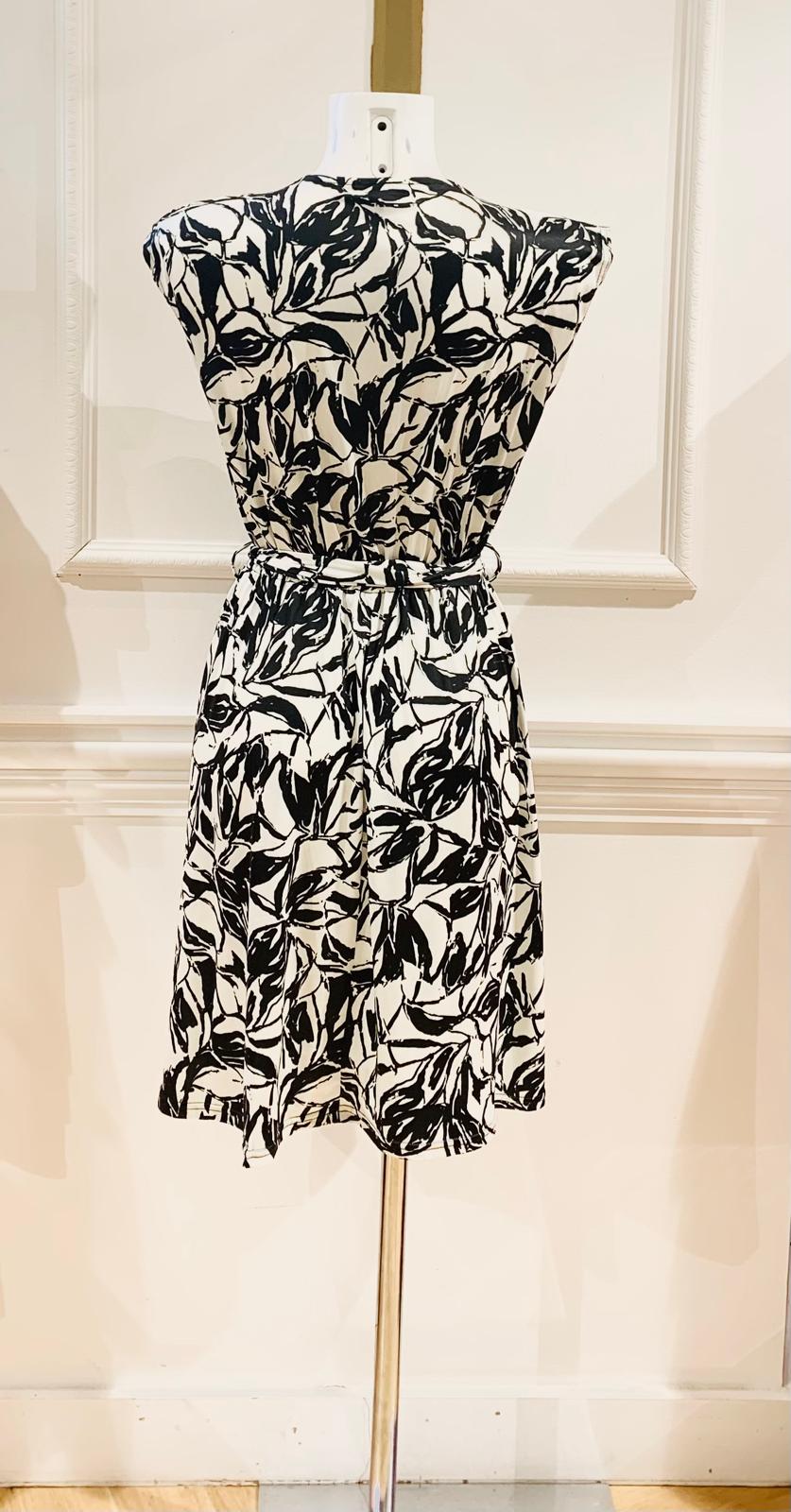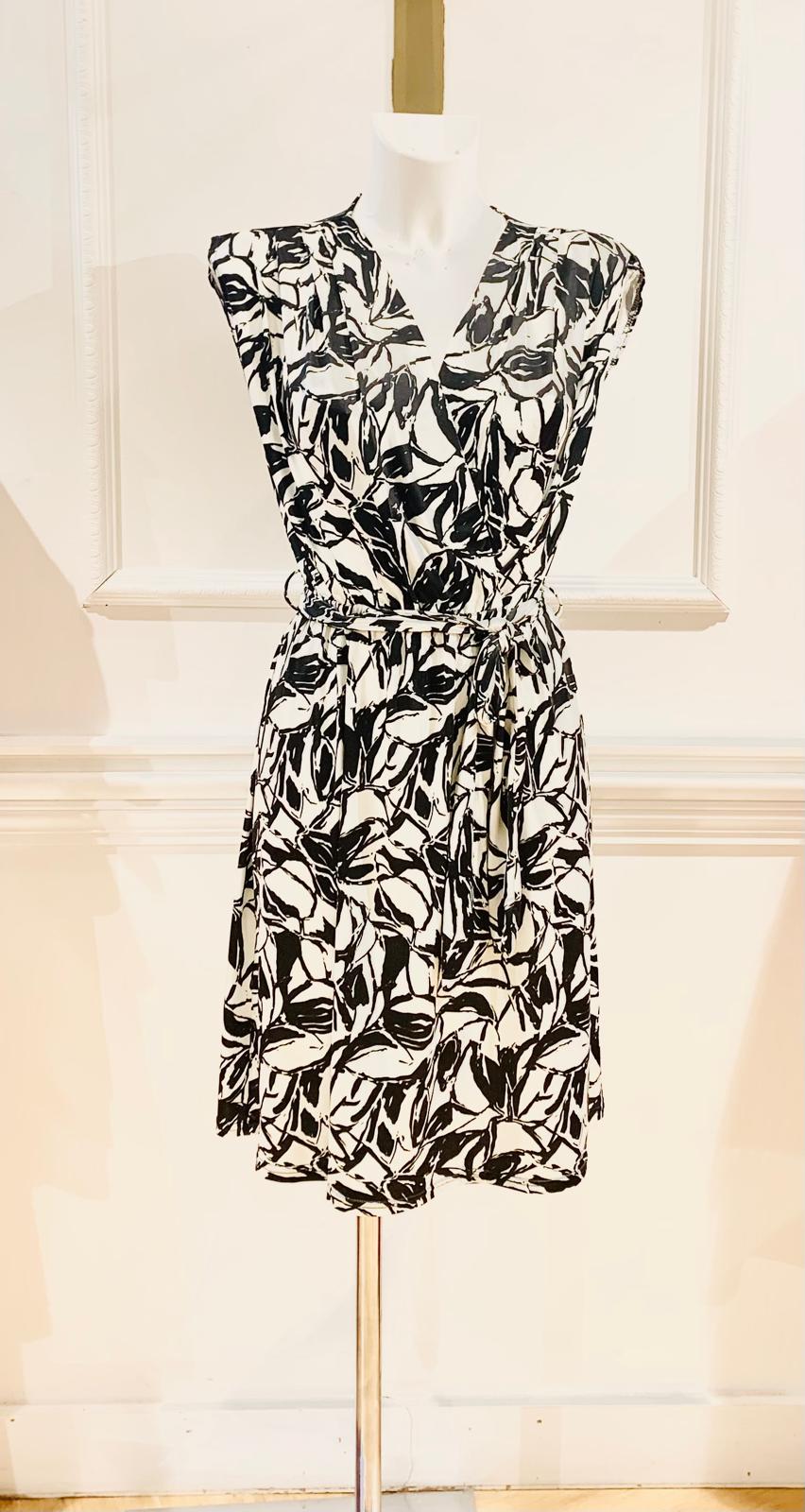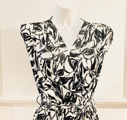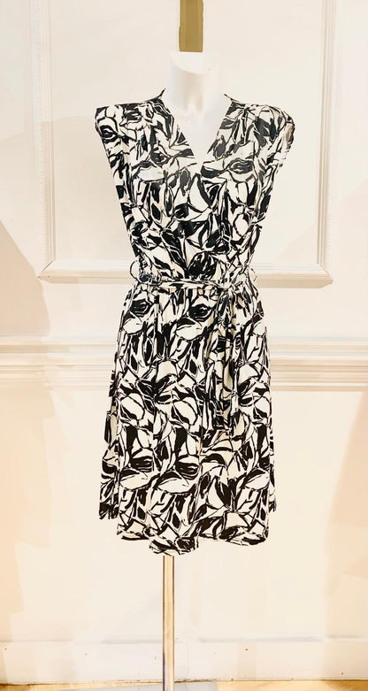 Fabriquée avec soin dans nos ateliers parisiens, cette robe courte d’été sans manches sublime la silhouette grâce à son col en V et sa ceinture délicate à nouer sur le côté. Sa coupe fluide épouse le corps avec légèreté, tandis que son imprimé de feuilles noires sur fond blanc apporte une note graphique, intemporelle et raffinée, fidèle au chic parisien.