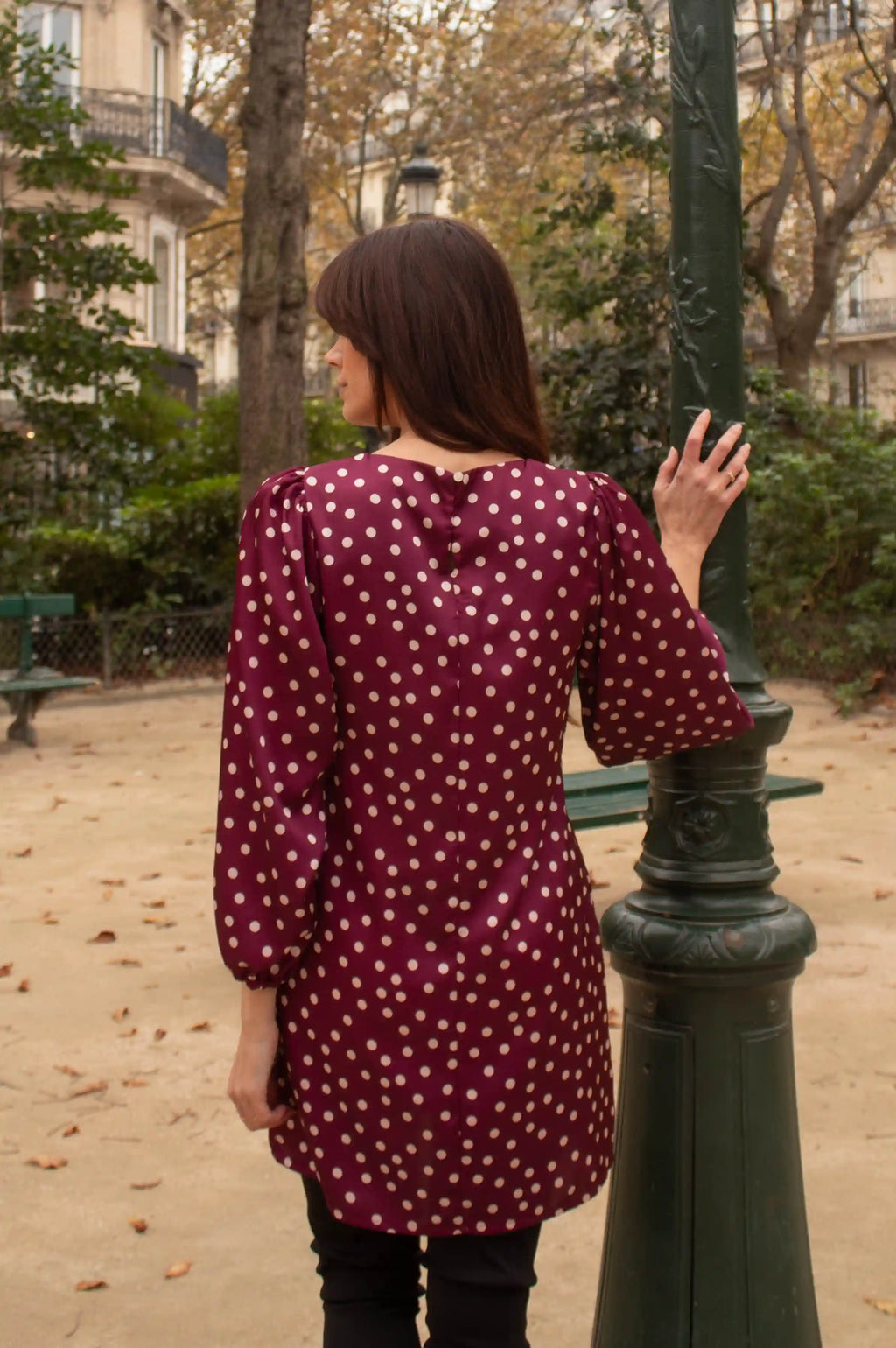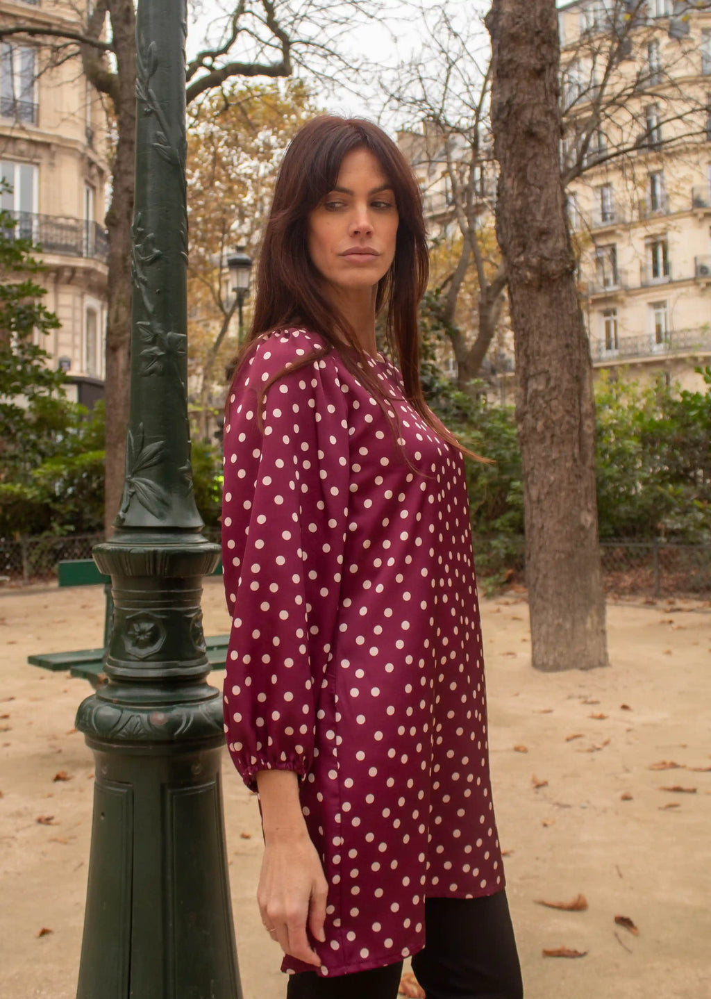 Confectionnée avec soin dans notre atelier parisien, cette robe reflète tout le savoir-faire artisanal français. Son imprimé à pois subtil sur un fond rouge bordeaux confère une élégance classique tout en sublimant toutes les silhouettes.