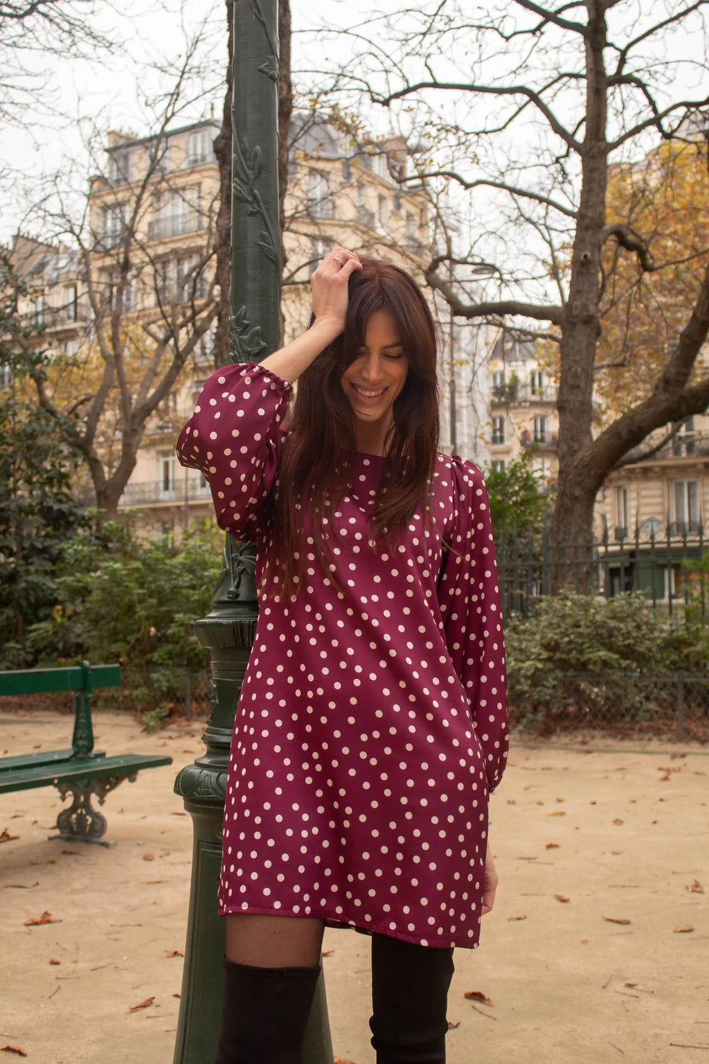 Disponible dans d’autres coloris et imprimés, la Robe Alfy Rouge Bordeaux À Pois est un incontournable pour une garde-robe parisienne féminine et polyvalente.