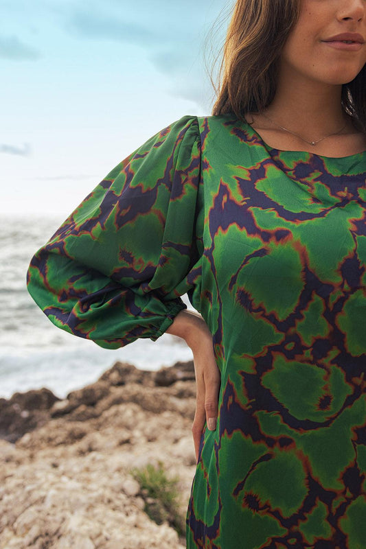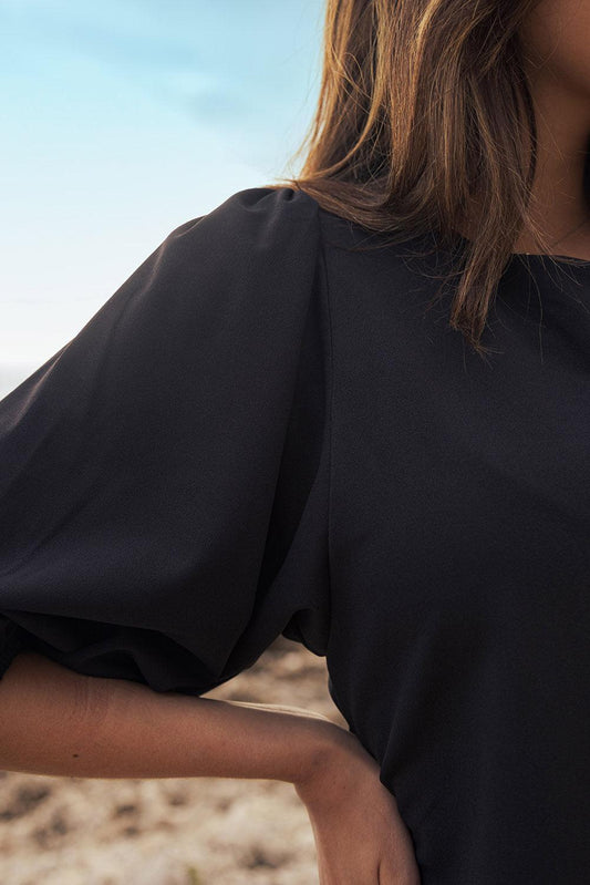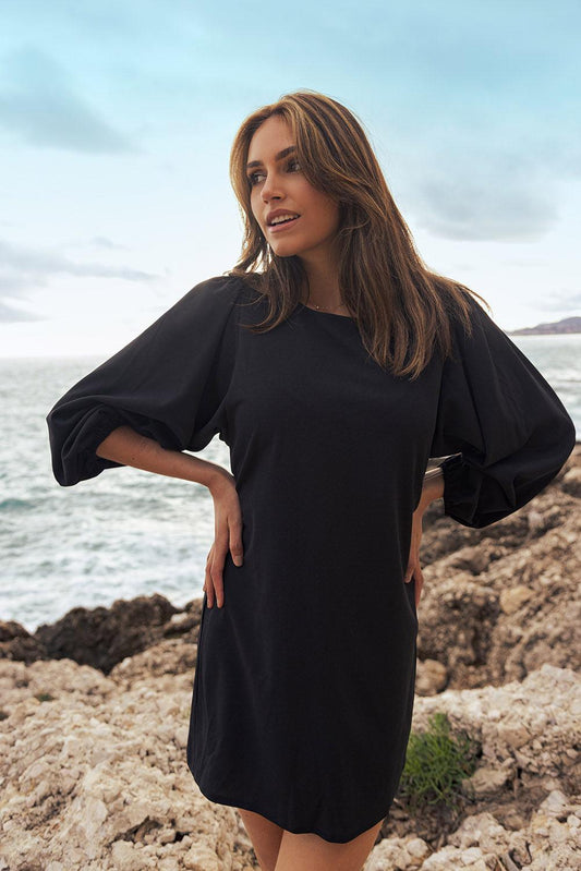Robe courte et ample, au porter fluide et aux manches bouffantes pour se sentir à l'aise en toute circonstance.