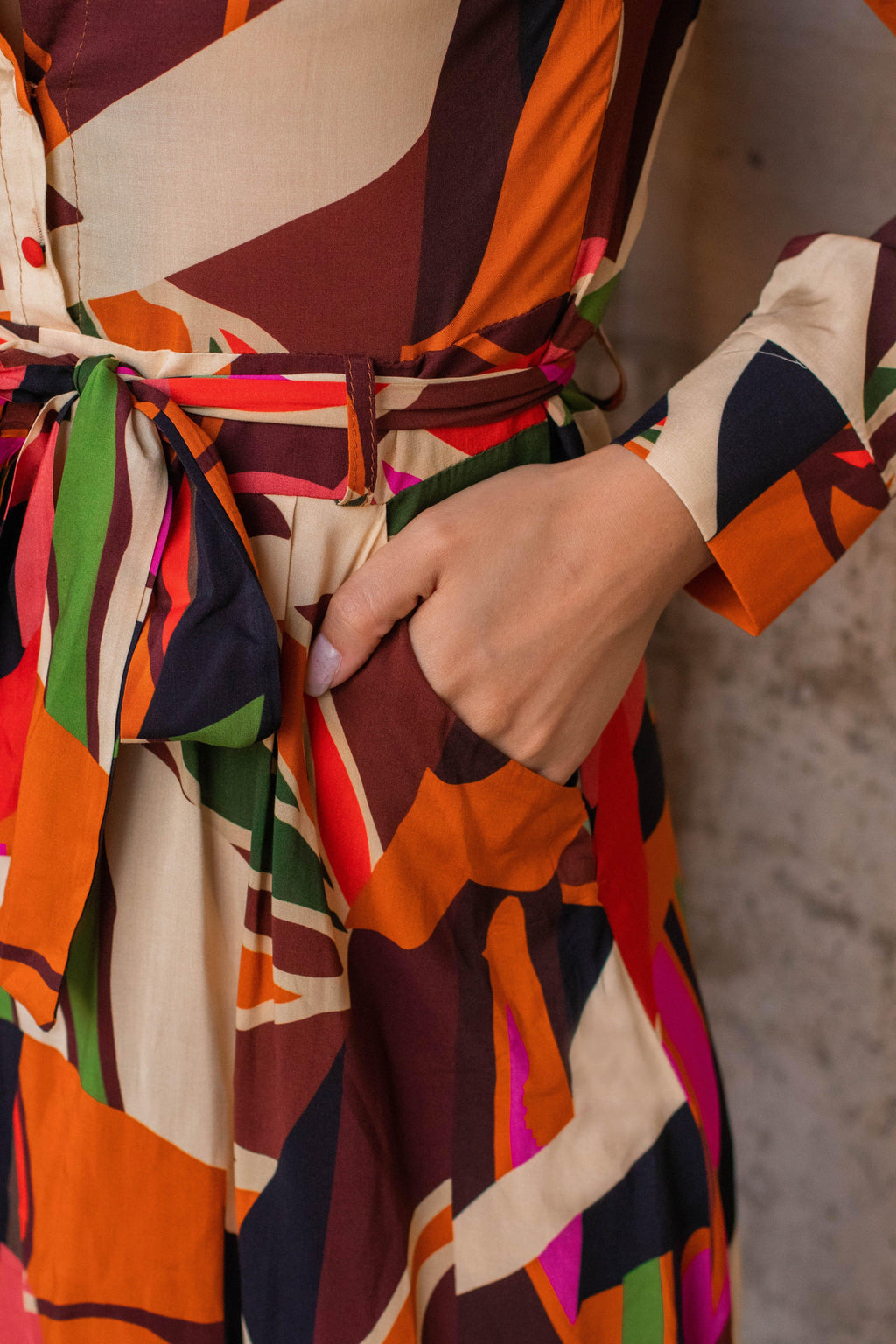 Fabriquée dans un tissu élégant et doux, cette robe offre avec son col chemise et sa ceinture à passants une silhouette fluide et féminine. Son imprimé multicolore apporte une touche de créativité tout en restant dans l'air du temps, parfait pour exprimer votre style à la française.