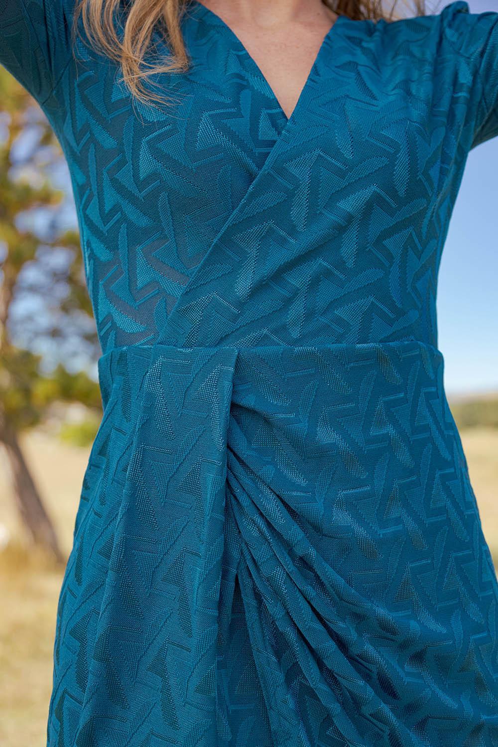 Cette splendide robe à la forme cache-cœur et à la longueur genou se distingue par son tissu jacquard original et sa couleur vitaminée.