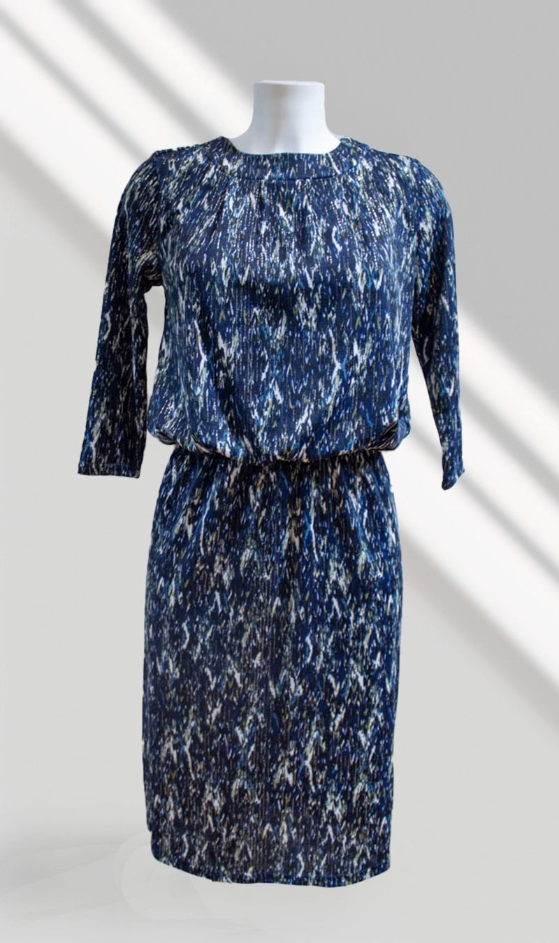 Avec sa coupe droite et sa longueur genou, cette pièce assure un équilibre parfait entre confort et sophistication. Le col rond et les manches 3/4 apportent une allure classique et intemporelle, tandis que le détail goutte d’eau dans le dos, orné d’un fil brillant, dévoile une subtile touche de féminité. Son imprimé bleu et blanc lumineux ajoute une note de fraîcheur et d’originalité à cette robe polyvalente.