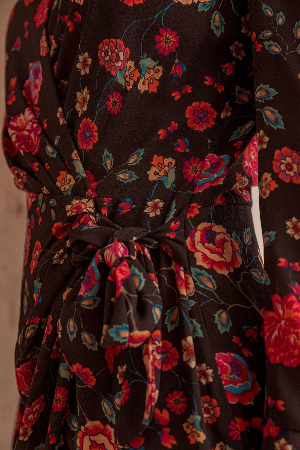 Cette élégante robe portefeuille à la longueur mi-cuisse et droite, se distingue par son imprimé lumineux et estival.
