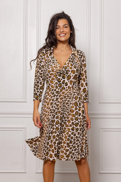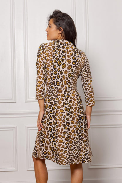 Cette robe midi jusqu'au genou se distingue par son imprimé léopard élégant aux tâches marrons et jaunes sur un fond blanc immaculé. Sa coupe évasée offre une silhouette féminine et fluide, tandis que le décolleté en V plongeant et les manches 3/4 ajoutent une touche de modernité et de sophistication. Fabriquée à Paris, cette robe élégante française incarne le chic parisien avec une touche sauvage.