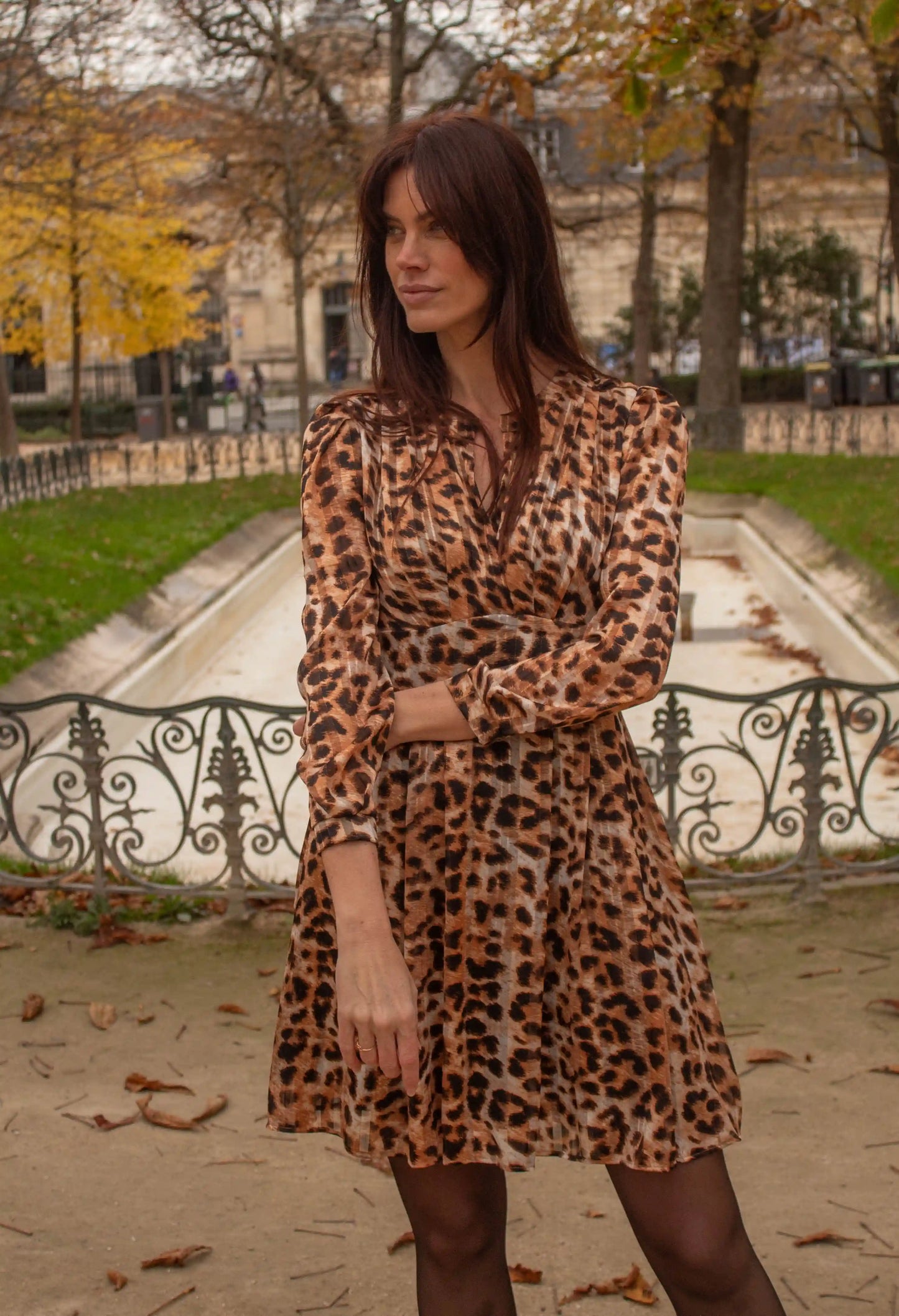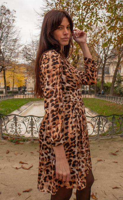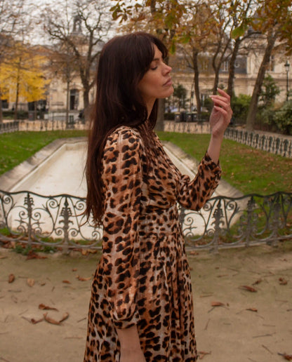 Confectionnée en France dans notre atelier parisien, la robe Alya se distingue par son imprimé animalier panthère, à la fois chic et intemporel. Ses manches longues ballon apportent du mouvement et une touche glamour, tandis que le col en V met en valeur le décolleté avec élégance.