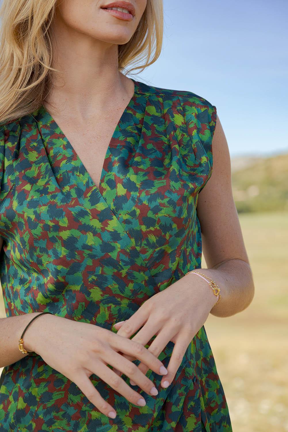 Cette élégante robe portefeuille à la longueur mi-cuisse et droite, se distingue par son imprimé qui donne du peps à votre garde robe et de la couleur à vos journées.