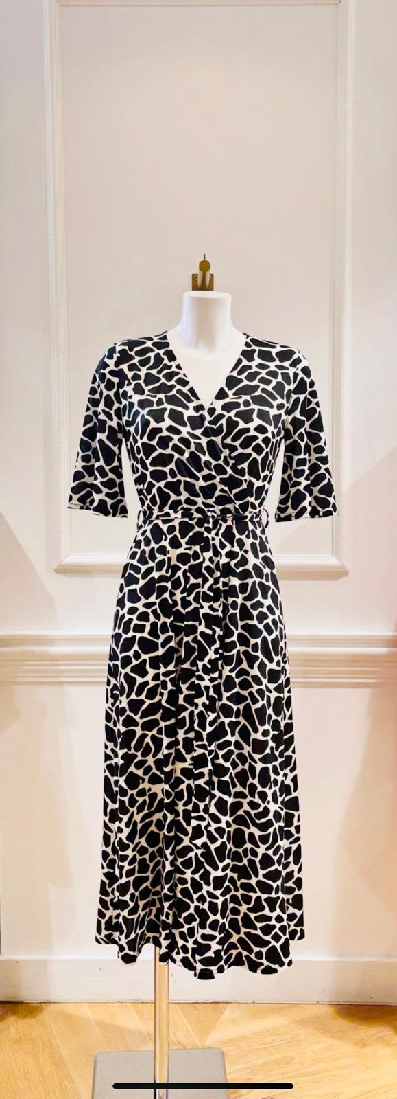 Confectionnée avec soin dans nos ateliers parisiens, cette robe Made in France se distingue par sa coupe fluide et féminine, idéale pour sublimer chaque silhouette. Son col cache-cœur flatteur met en valeur le décolleté, tandis que sa taille cintrée avec ceinture intégrée dessine une silhouette harmonieuse. Ses manches 3/4 ajoutent une touche de raffinement, et sa jupe longue évasée accompagne élégamment chacun de vos mouvements. Son imprimé noir et blanc inspiré du motif Panda apporte une touche graphique et moderne, parfaite pour celles qui recherchent une tenue à la fois audacieuse et intemporelle.