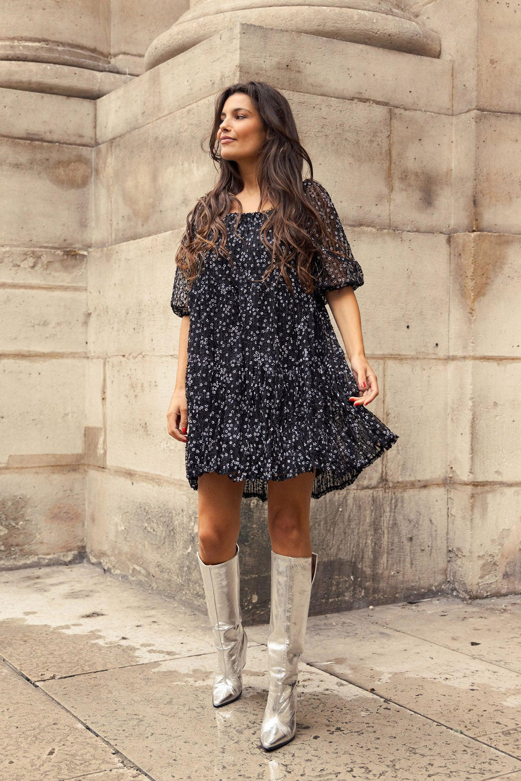 Cette robe, confectionnée à Paris, se distingue par son fond noir classique, sublimé par de petites fleurs blanches qui apportent une touche de fraîcheur et de douceur à l’ensemble. Sa coupe midi évasée, avec un col carré sophistiqué et des manches courtes ballons, assure une silhouette gracieuse et flatteuse. La taille ajustée complète l'ensemble pour offrir une tenue qui met en valeur la féminité tout en restant confortable et facile à porter au quotidien.