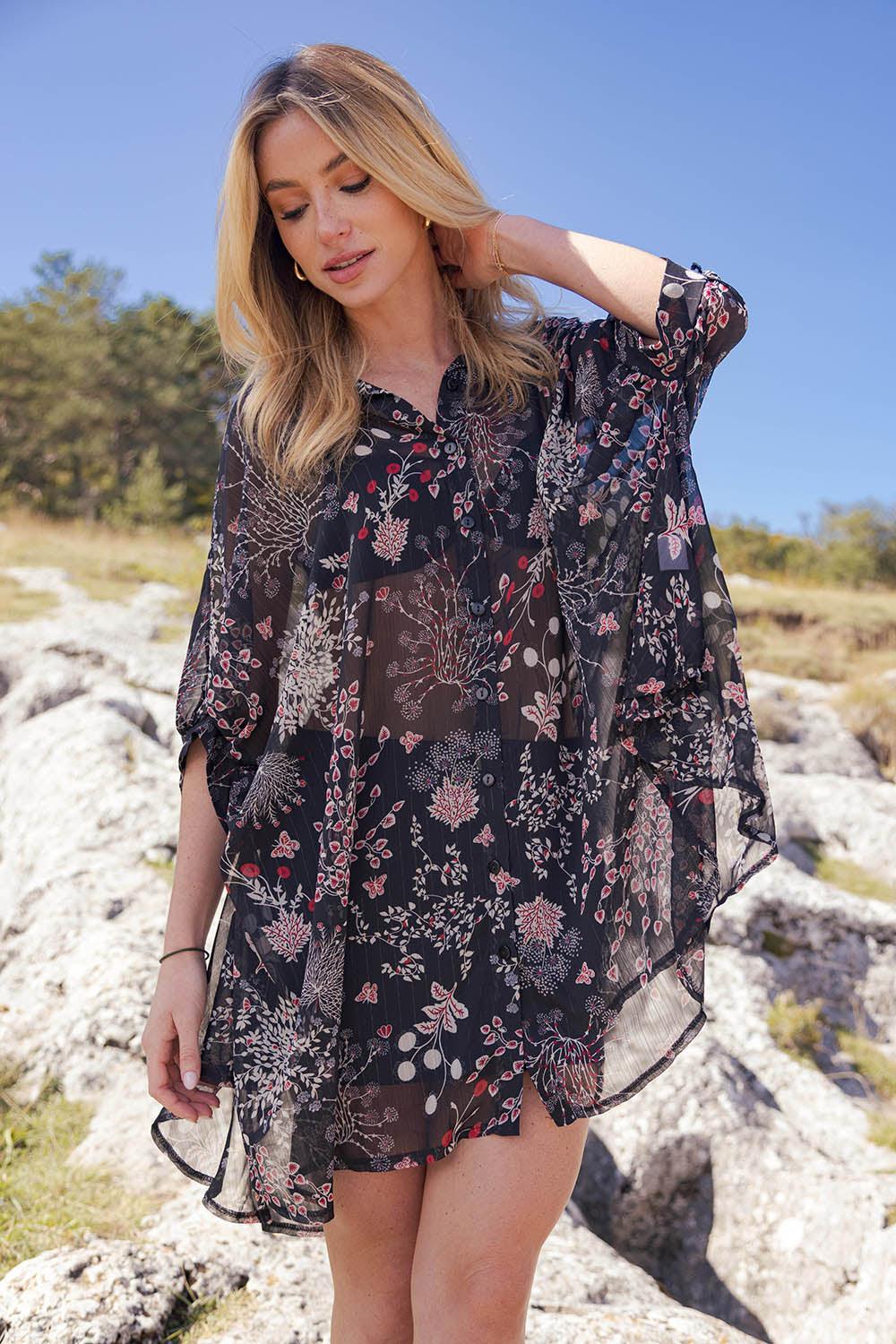 Fabriquée dans un voile léger et transparent, cette robe offre une silhouette aérienne et féminine. Son motif cachemire noir ajoute une note de fraîcheur et de fantaisie à cette pièce chic et décontractée.