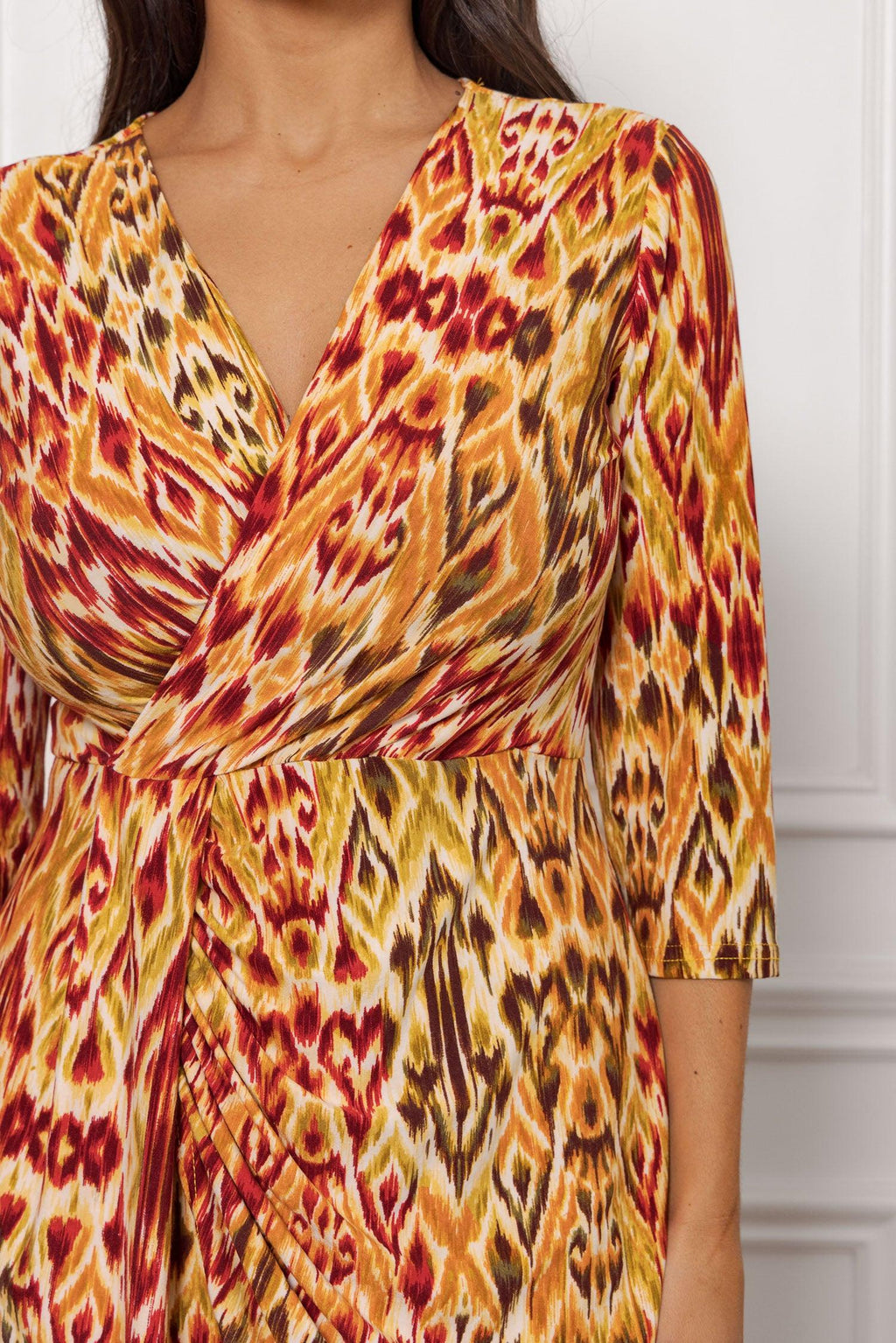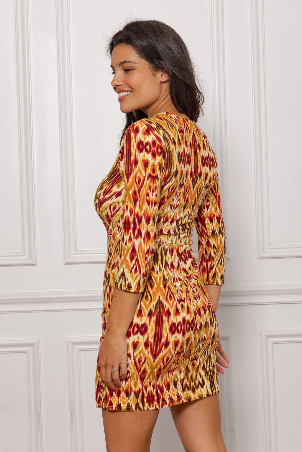 Cette robe courte, confectionnée avec soin dans notre atelier parisien, présente un col cache-cœur flatteur, des manches 3/4 élégantes et une taille cintrée qui sublime votre silhouette. Son imprimé arty aux teintes vibrantes de jaune et d'orange, parsemé de touches artistiques, apporte une note de modernité et de créativité à cette robe chic française.