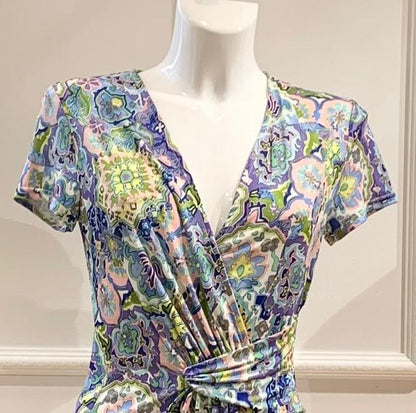 Dotée d’une coupe courte fluide, d’un col en V délicat et de manches courtes, cette robe en maille douce épouse le corps avec légèreté. Sa ceinture élastique souligne naturellement la taille sans comprimer, offrant une silhouette flatteuse et confortable. L’imprimé psychédélique façon cachemire, dans des teintes vibrantes de bleu et de rose, insuffle une énergie rétro et artistique qui dynamise cette robe chic parisienne.