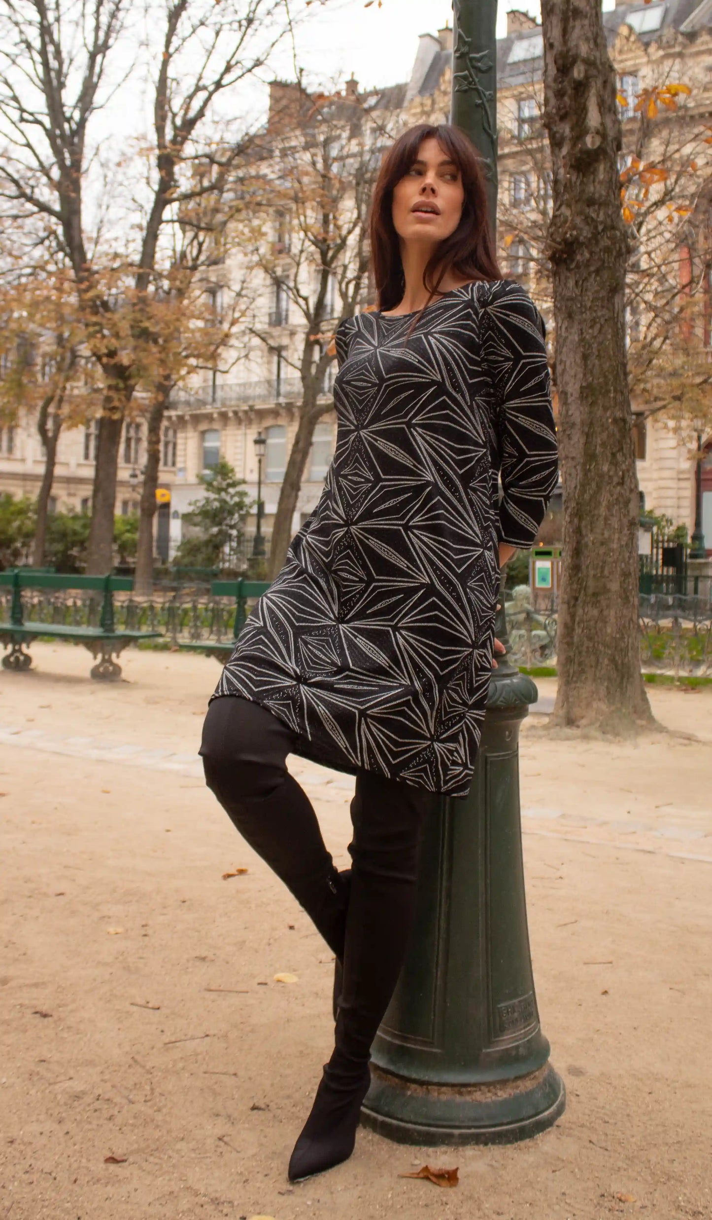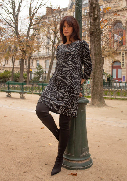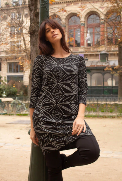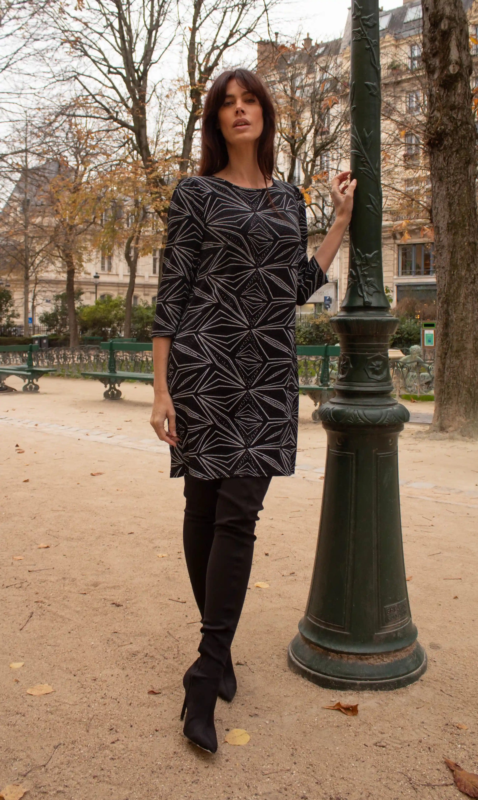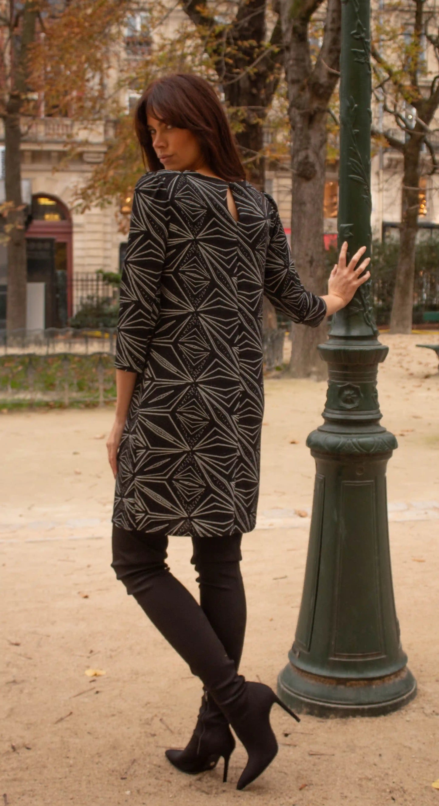 Confectionnée avec soin dans notre atelier parisien, cette robe incarne le savoir-faire de la mode française. Son imprimé géométrique argenté sur un fond noir intemporel crée un design original et raffiné, tandis que sa coupe ajustée et ses manches 3/4 flattent votre silhouette. Son col en V ajoute une touche de féminité et d’élégance.