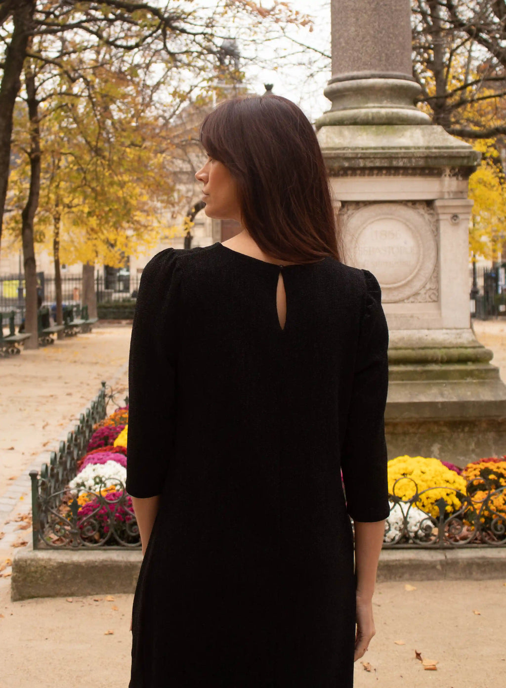 Confectionnée avec soin dans notre atelier parisien, cette robe met en avant tout le savoir-faire de la mode française. Sa coupe ajustée et ses manches 3/4 flattent subtilement votre silhouette, tandis que son fond noir classique est rehaussé de détails festifs discrets mais éclatants. Son col en V apporte une touche de féminité et d’élégance supplémentaire.