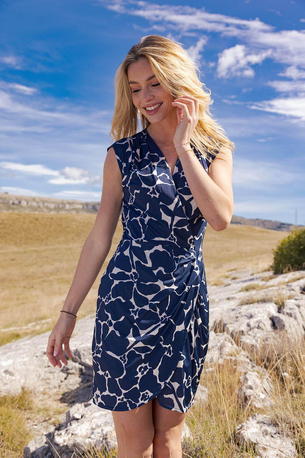 Cette élégante robe portefeuille à la longueur mi-cuisse et droite, se distingue par son délicat imprimé.