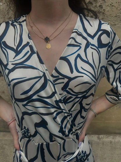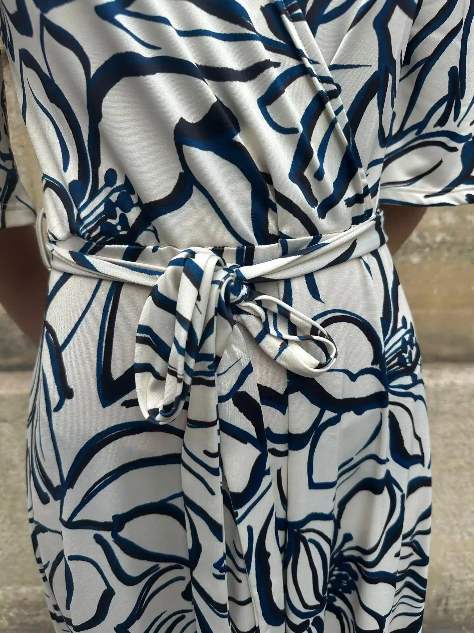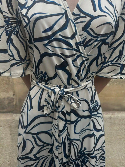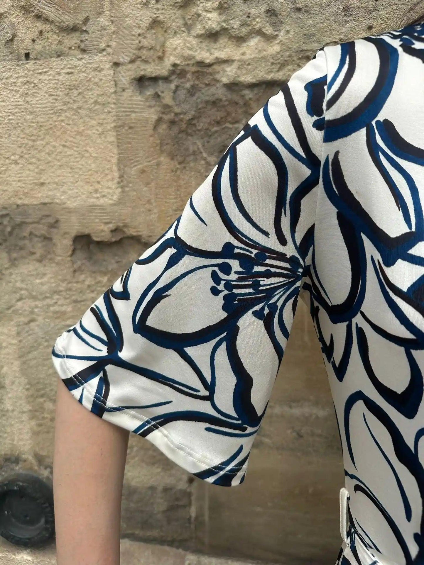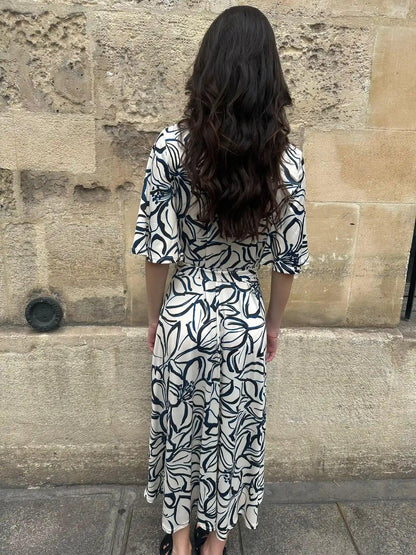 Robe Longue Rosas Blanche Feuillage Bleu Manches Volantes