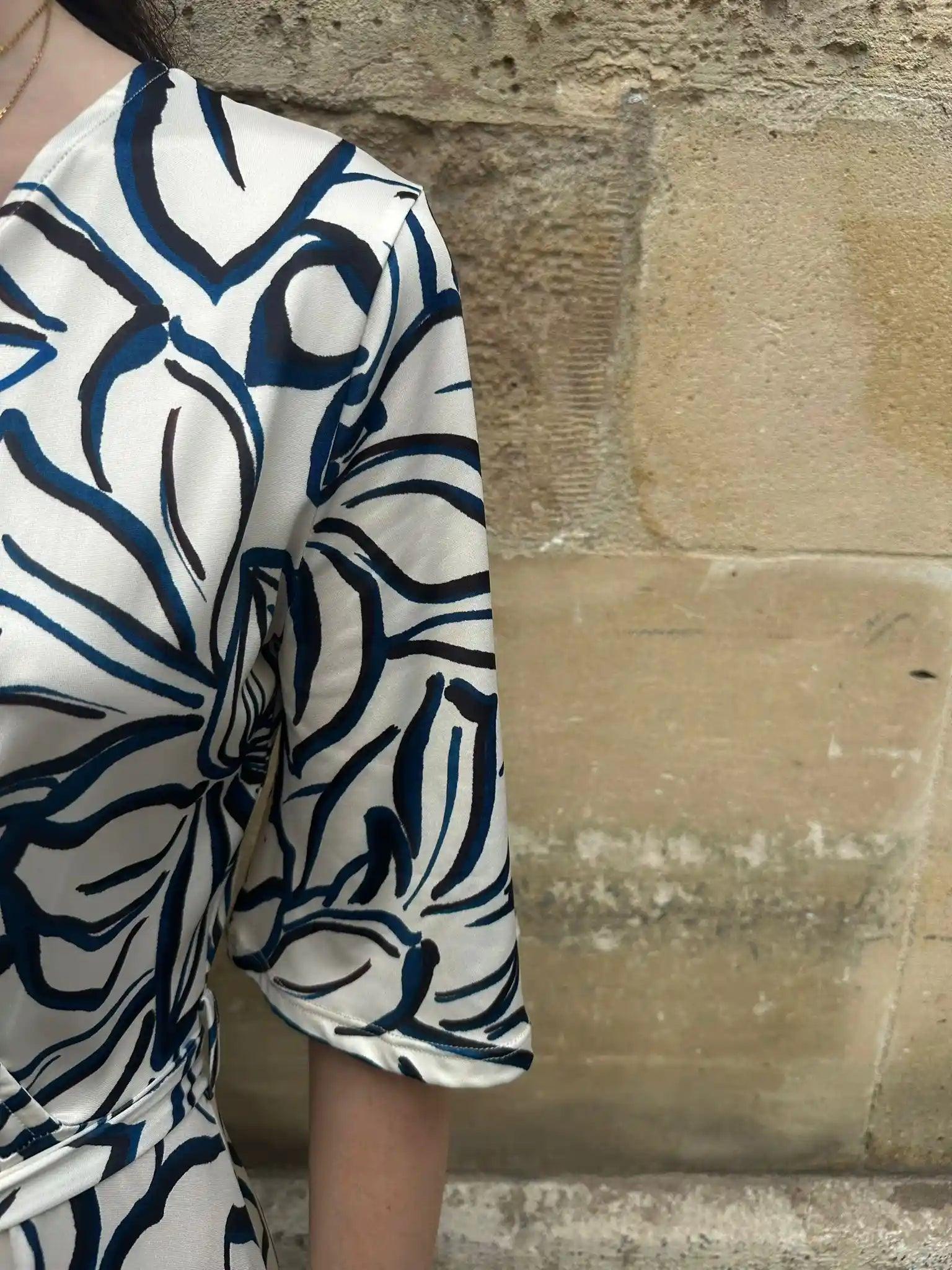 Son imprimé Feuillage Bleu Marine réveille une coupe classique.