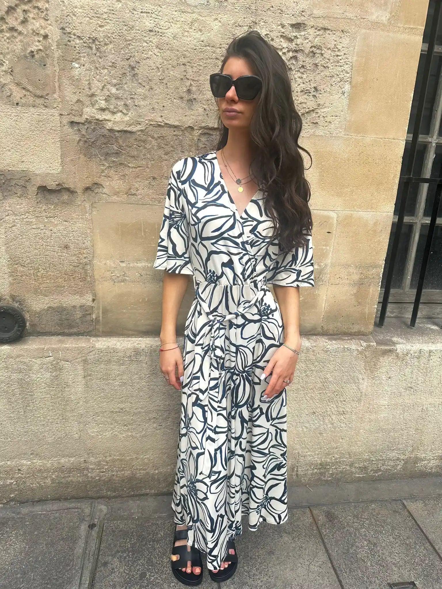 Cette Robe est fabriquée en France dans notre atelier parisien. Nous avons imaginé un imprimé orange à fleurs pour rappeler les couleurs de l'été et des vacances.