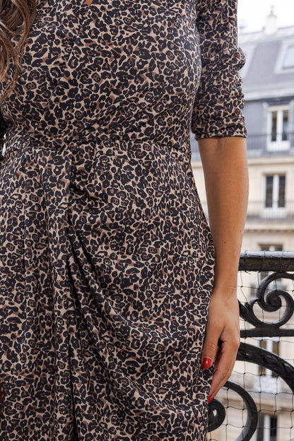 Cette robe courte, confectionnée avec soin dans notre atelier parisien, présente un col cache-cœur élégant et des manches 3/4 sophistiquées. Sa taille cintrée met en valeur votre silhouette, tandis que sa teinte choco rehaussée de tâches léopard apporte une touche d'originalité et d'audace. Véritable symbole de l'élégance française, cette robe parisienne est le choix idéal pour celles qui souhaitent allier raffinement et tendance.