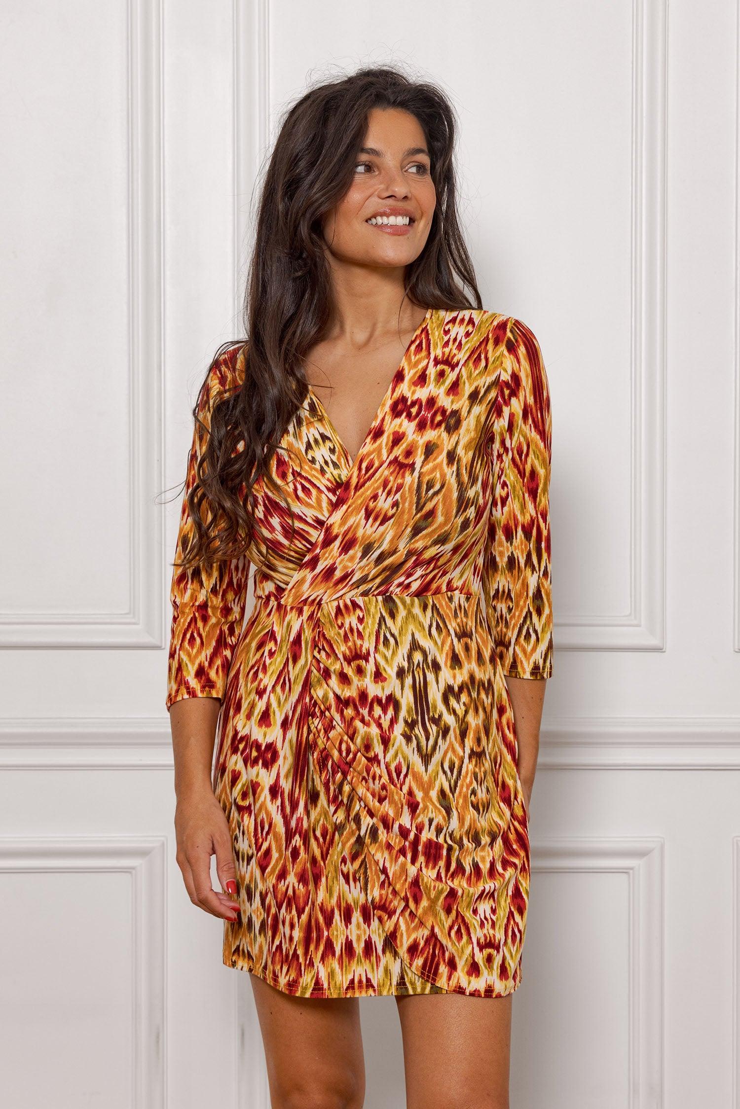 Cette robe courte, confectionnée avec soin dans notre atelier parisien, présente un col cache-cœur flatteur, des manches 3/4 élégantes et une taille cintrée qui sublime votre silhouette. Son imprimé arty aux teintes vibrantes de jaune et d'orange, parsemé de touches artistiques, apporte une note de modernité et de créativité à cette robe chic française.
