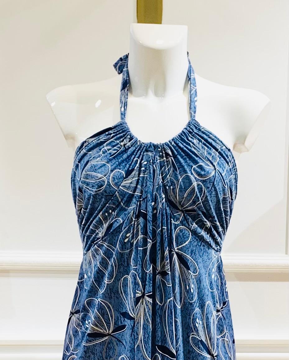 Confectionnée en maille douce, cette robe longue sans manches dévoile un dos nu élégant et un col rond légèrement décolleté. Le lien à nouer dans le dos permet un ajustement sur mesure. Son fond bleu profond est rehaussé de fleurs blanches et noires, offrant une esthétique à la fois fraîche et raffinée.