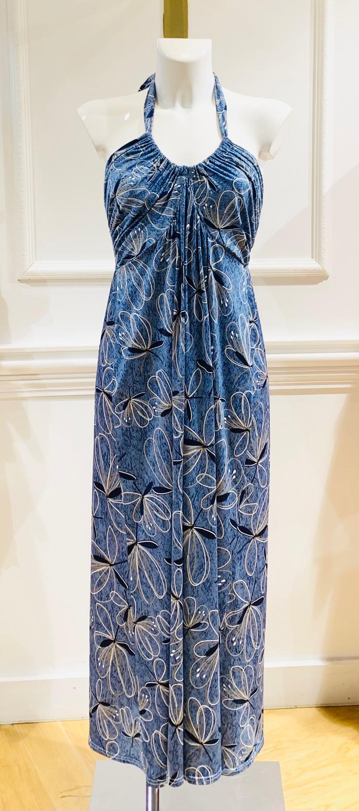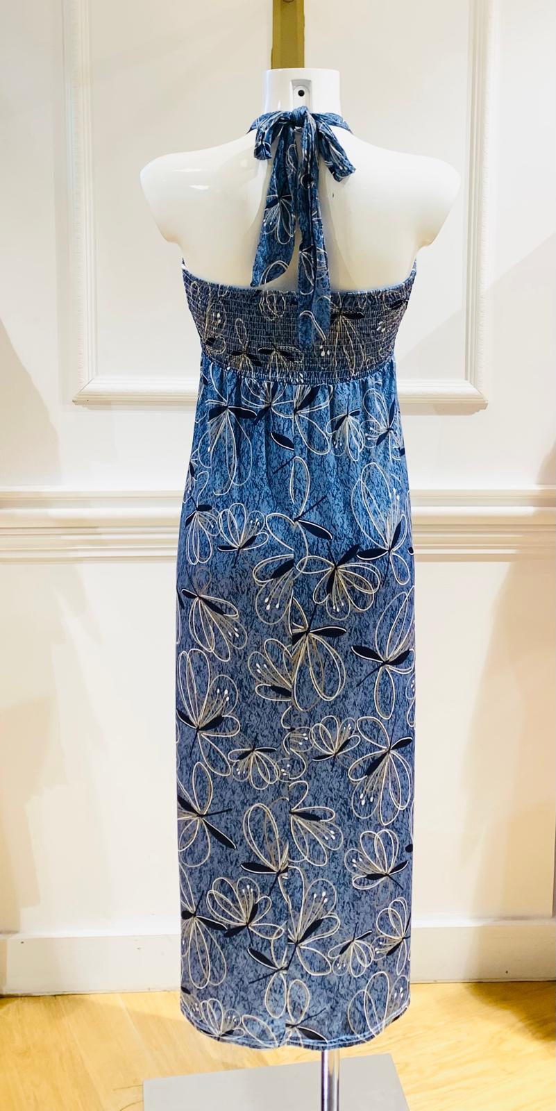 Robe Longue Camélia Bleue Fleurs Blanches & Noires