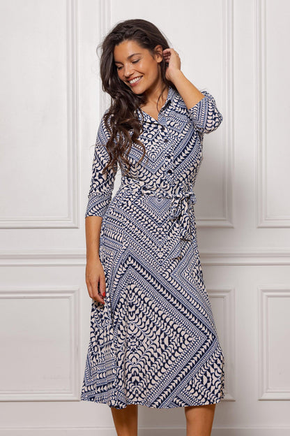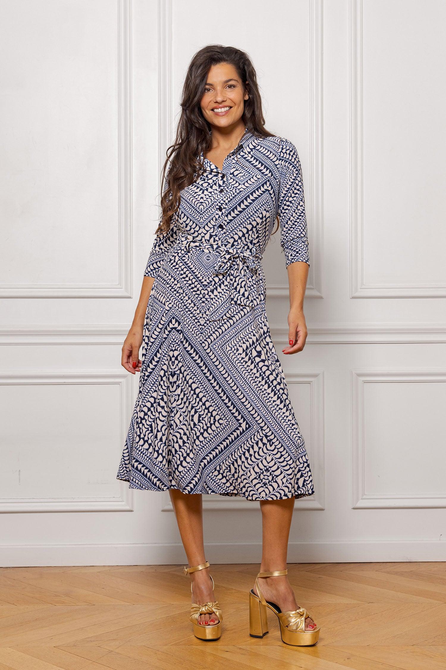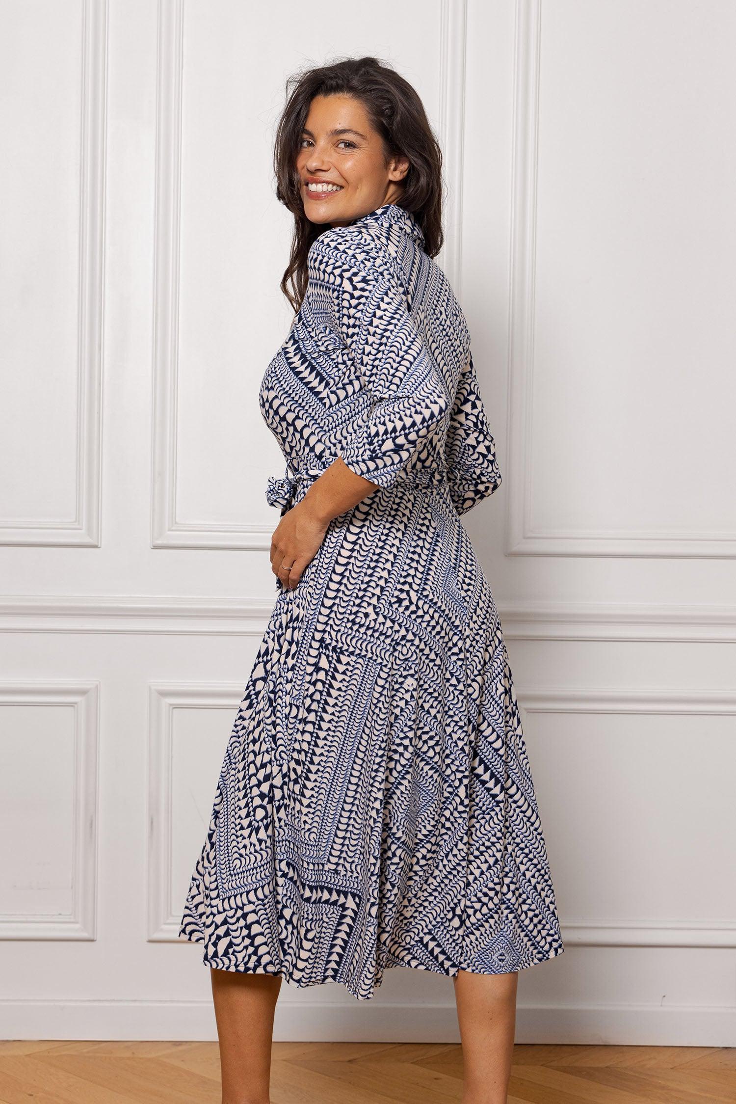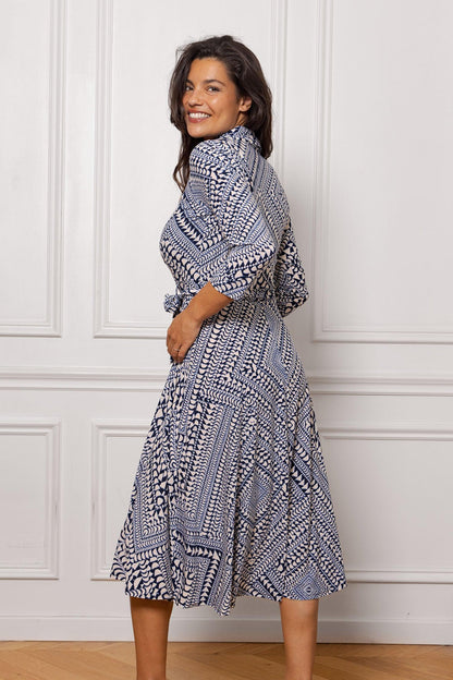 Avec ses motifs géométriques écrus sur un fond bleu profond, cette robe est conçue pour celles qui recherchent une allure moderne et sophistiquée. Sa coupe ajustée à la taille, agrémentée d'une ceinture, ainsi que son col chemise en V plongeant apportent un raffinement supplémentaire. Les manches 3/4 offrent à la fois confort et style, tandis que le design ethnique assure une touche d’originalité subtile.