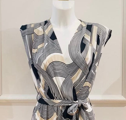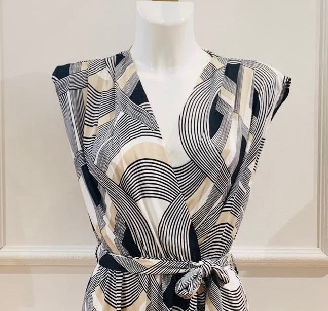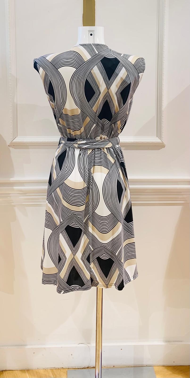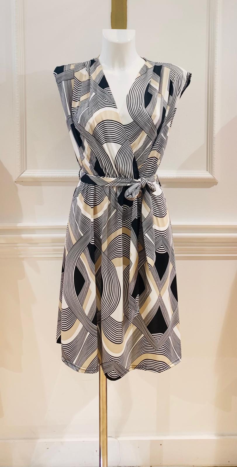 Conçue dans nos ateliers parisiens, cette robe courte sans manches associe confort et allure sophistiquée. Son col en V sublime le décolleté, tandis que la ceinture à nouer sur le côté souligne délicatement la taille. L’imprimé de lignes géométriques noires sur fond blanc évoque l’élégance rétro avec une touche contemporaine, fidèle à l'esprit chic de la mode française.