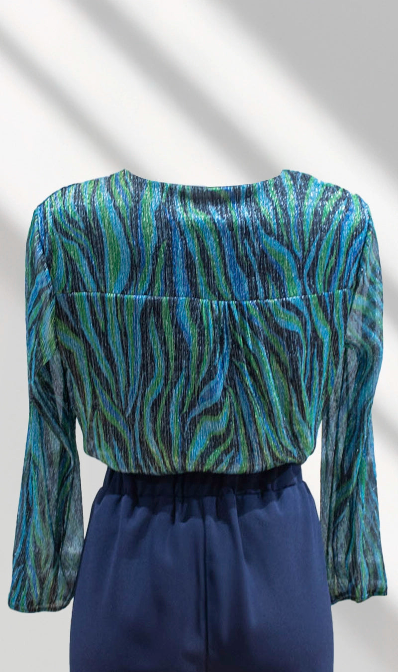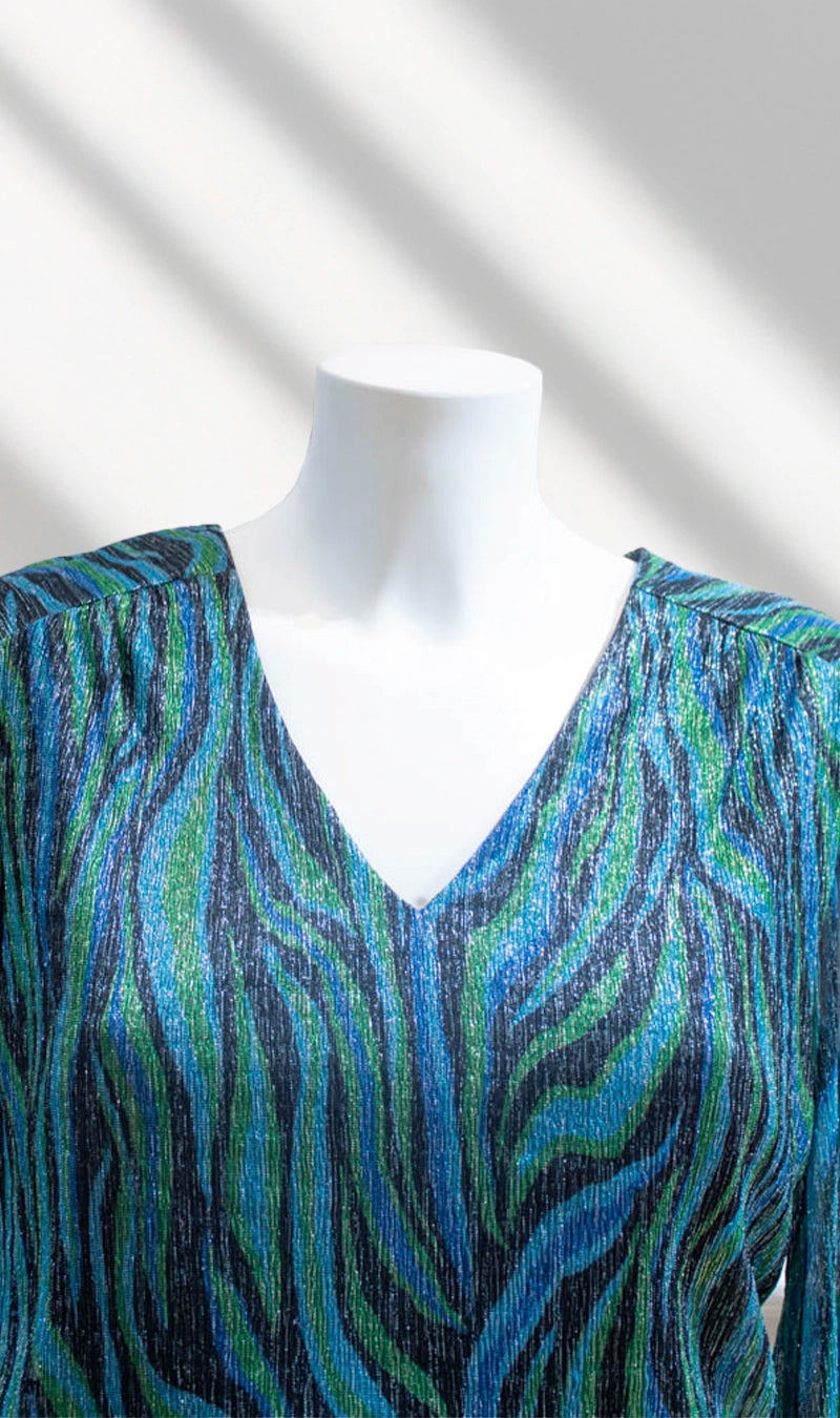 Son imprimé bleu et vert apporte une note de fraîcheur et d’originalité, tout en restant intemporel. Le T-shirt Marilyn se distingue par son col en V flatteur et ses manches longues, qui subliment toutes les silhouettes avec élégance. Sa conception en tissu chaîne et trame garantit un tombé impeccable et un confort optimal.