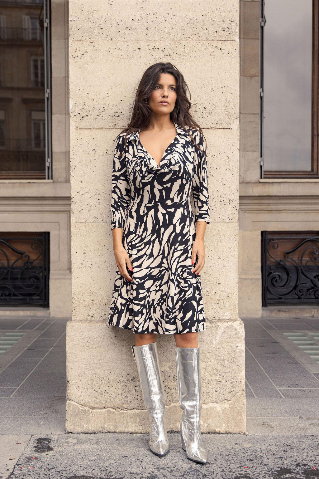 Cette robe courte, fabriquée avec soin dans notre atelier parisien, présente un motif de taches blanches sur un fond noir, créant un contraste chic et intemporel. Sa coupe cintrée met en valeur votre silhouette, tandis que le col en V plongeant et les manches 3/4 ajoutent une touche de féminité et de raffinement. Fabriquée en France, cette robe élégante française incarne le véritable chic parisien avec une qualité exceptionnelle.