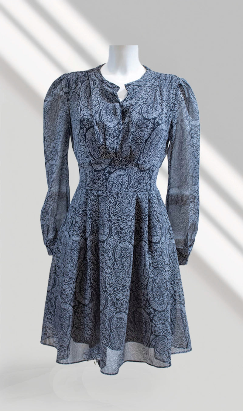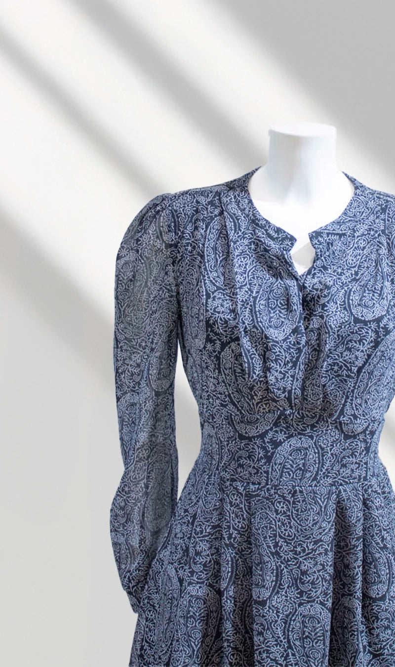 Confectionnée en France dans notre atelier parisien, la robe Alya séduit par son imprimé cachemire délicat sur un fond bleu profond, symbole d’élégance intemporelle. Ses manches longues ballon ajoutent du volume et du mouvement, tandis que le col en V sublime subtilement le décolleté.