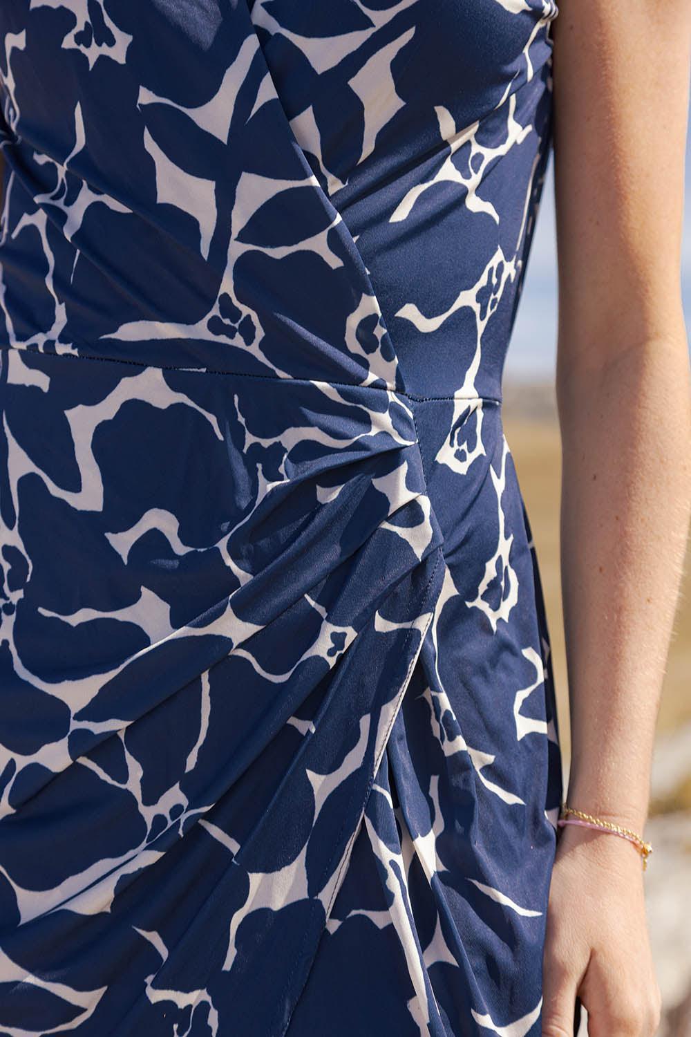Cette élégante robe portefeuille à la longueur mi-cuisse et droite, se distingue par son délicat imprimé.