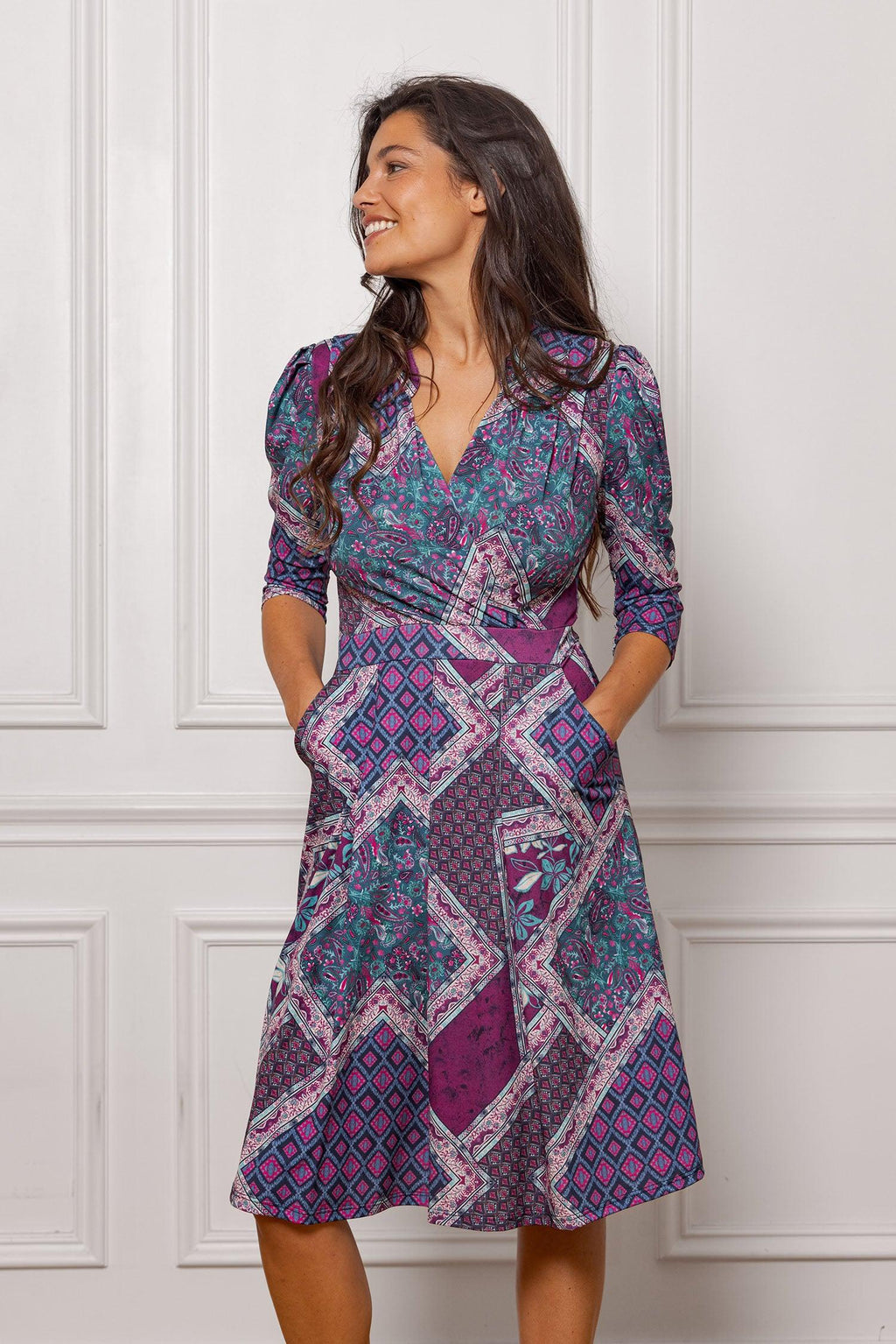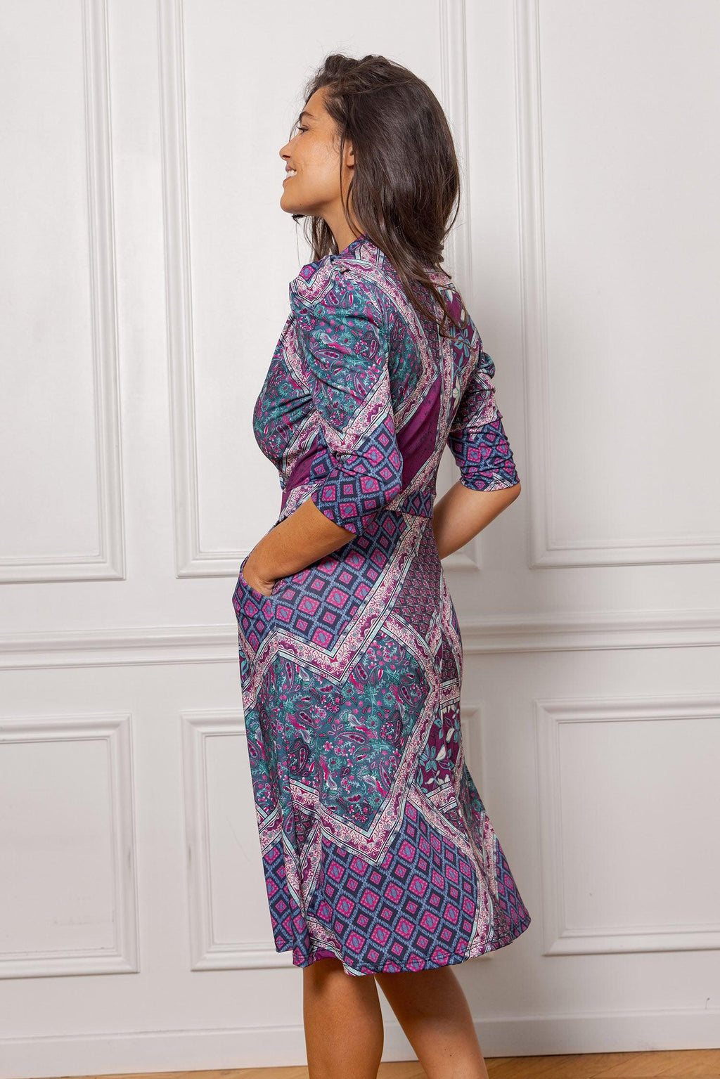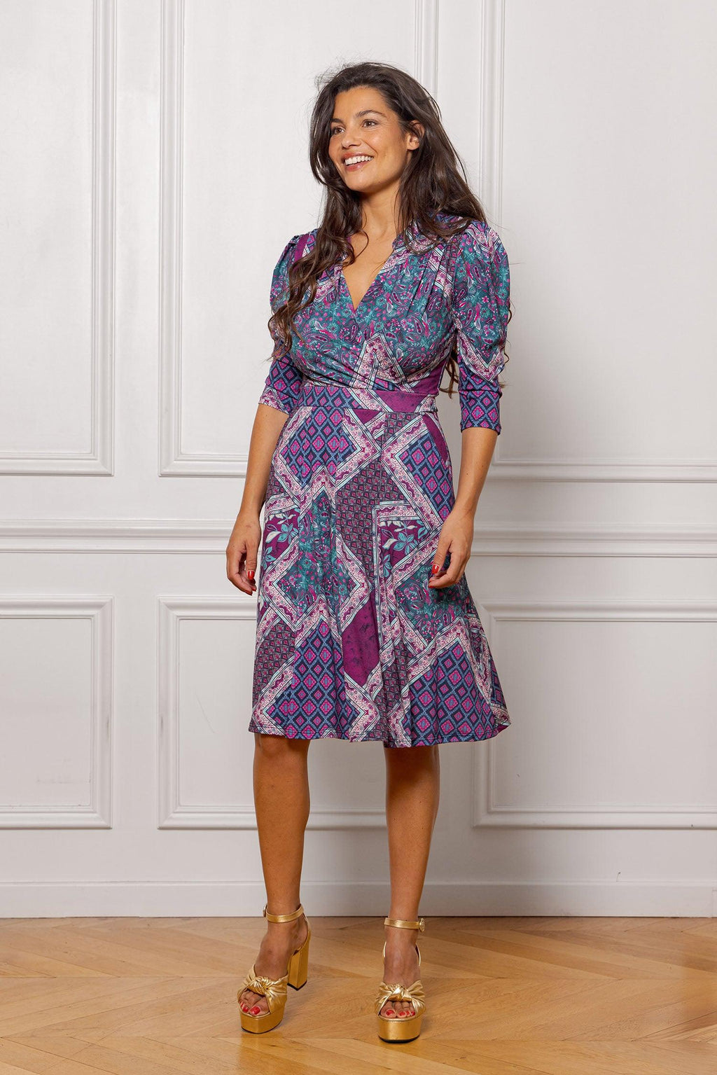 Cette robe courte à la longueur midi, atteignant les genoux, est dotée d'un col cache-cœur flatteur et de manches 3/4 sophistiquées. Sa taille cintrée souligne votre silhouette avec grâce. Le tissu présente un magnifique imprimé patchwork aux inspirations orientales, mêlant des nuances vibrantes de violet, rose et bleu. Cette robe élégante française est fabriquée avec soin dans notre atelier parisien, incarnant le chic parisien à son apogée.