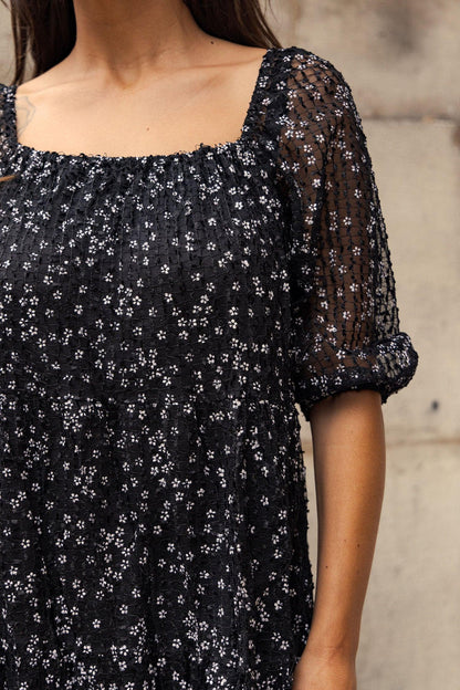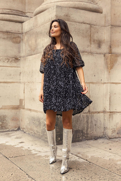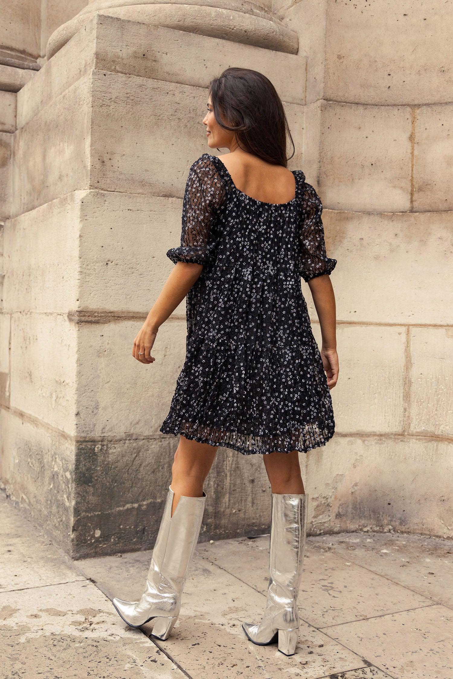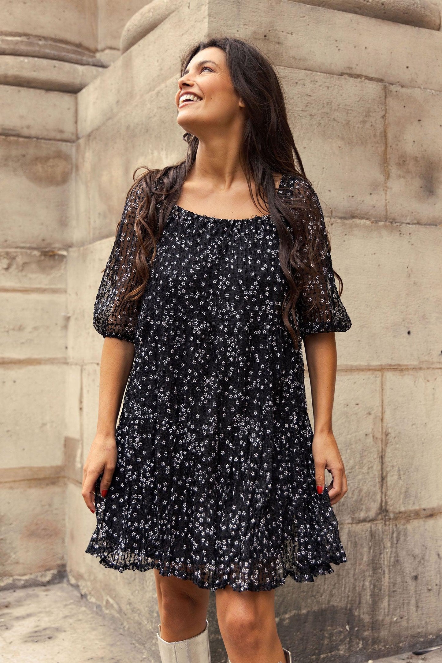 Laissez-vous séduire par la Robe courte Sony Noire Fleurs Blanches, une pièce élégante et délicate qui allie simplicité et féminité intemporelle.