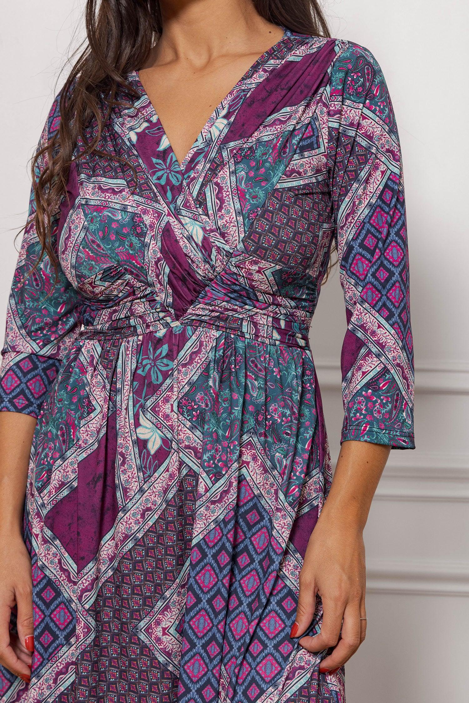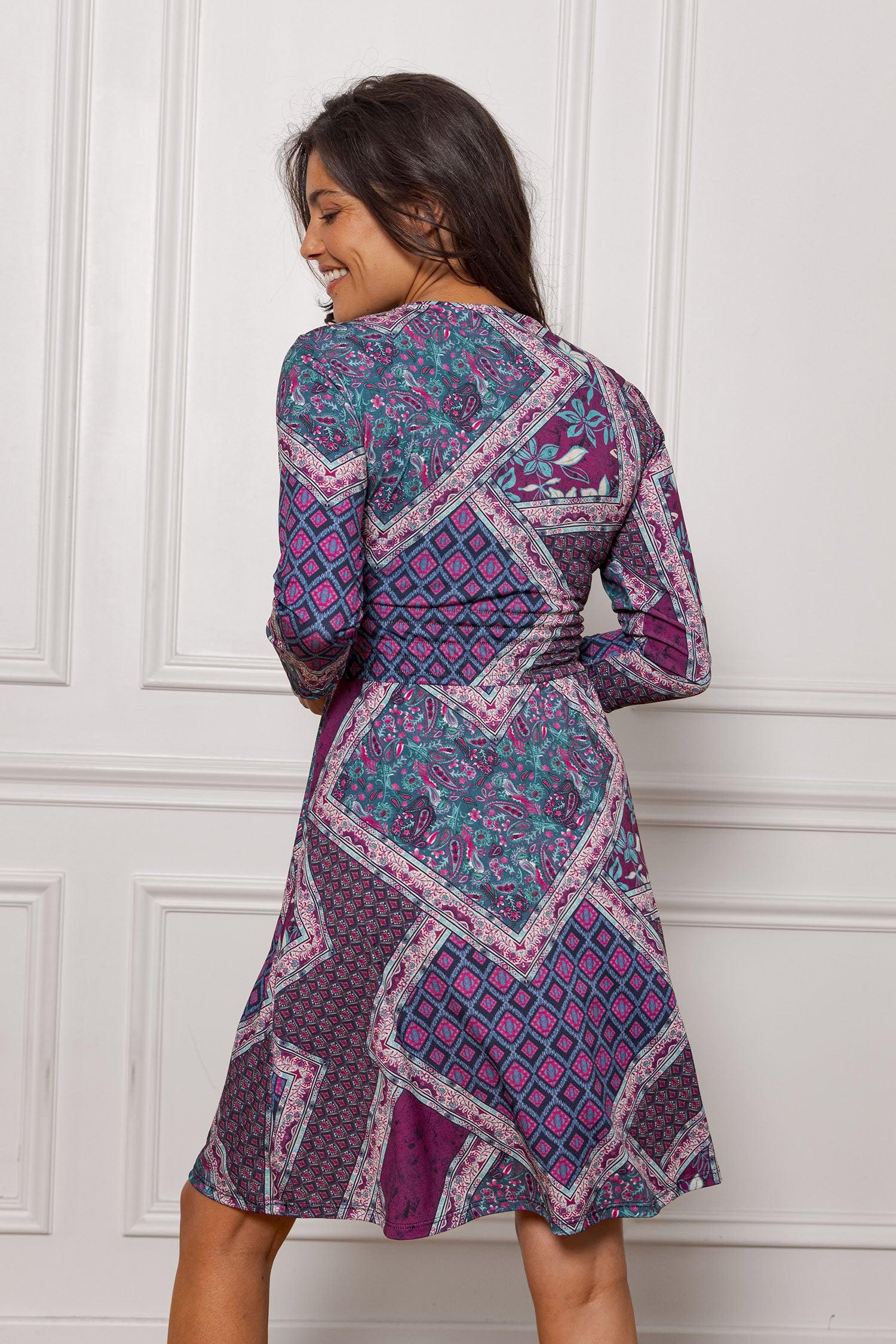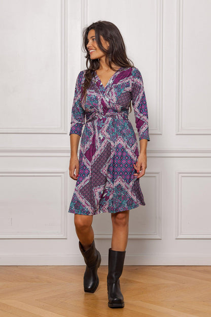 Cette robe courte, longueur midi jusqu'aux genoux, est dotée d'un col cache-cœur flatteur et de manches 3/4 pour une allure raffinée. La ceinture à la taille permet de cintrer la robe, mettant en valeur votre silhouette avec finesse. Son fond violet est magnifié par un imprimé de patchs violets, roses et bleus aux inspirations orientales, créant un mélange harmonieux de couleurs et de motifs captivants.